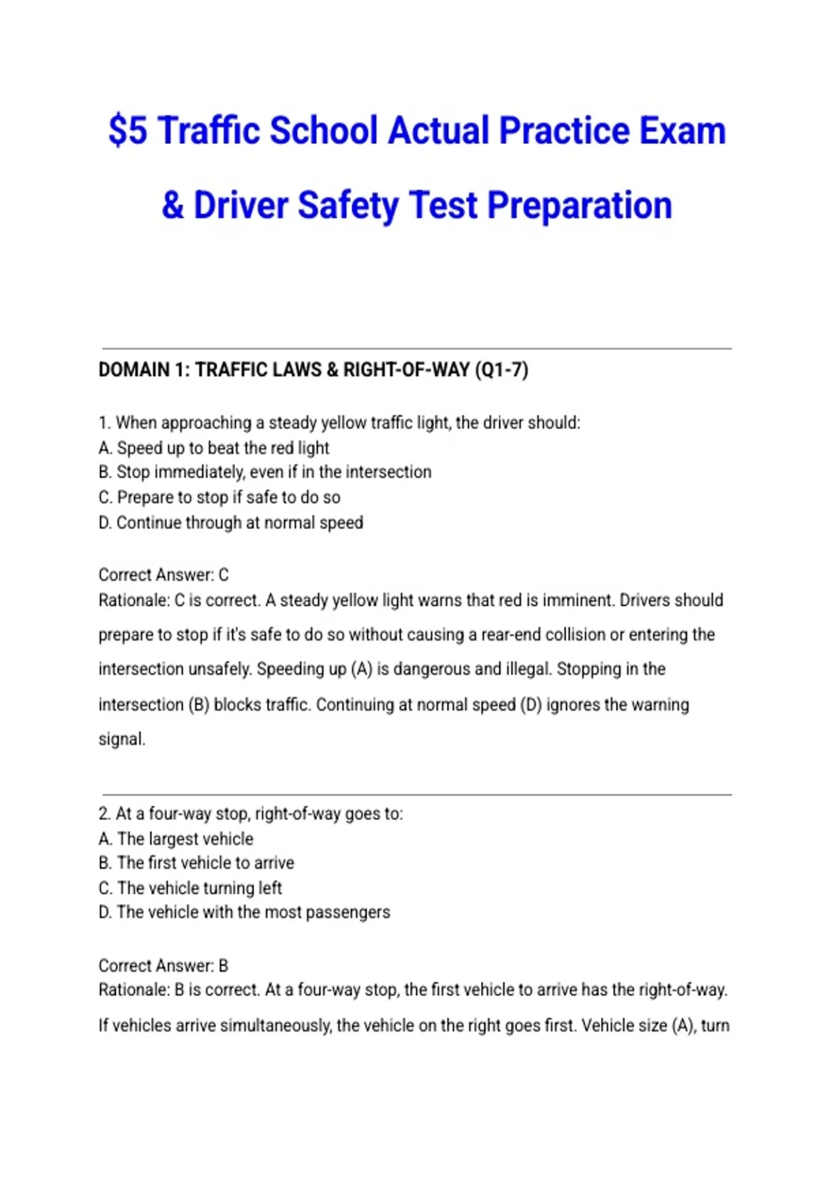 Complete $5 Traffic School practice exam designed for driver safety course completion and ticket dismissal preparation. This essential study resource features verified questions and answers covering traffic laws, road signs, right-of-way rules, defensive driving techniques, DUI regulations, and state-specific driving requirements. Perfect for drivers preparing for traffic school final examinations, with detailed explanations of safe driving practices and legal knowledge required to successfully complete traffic school and maintain driving privileges.