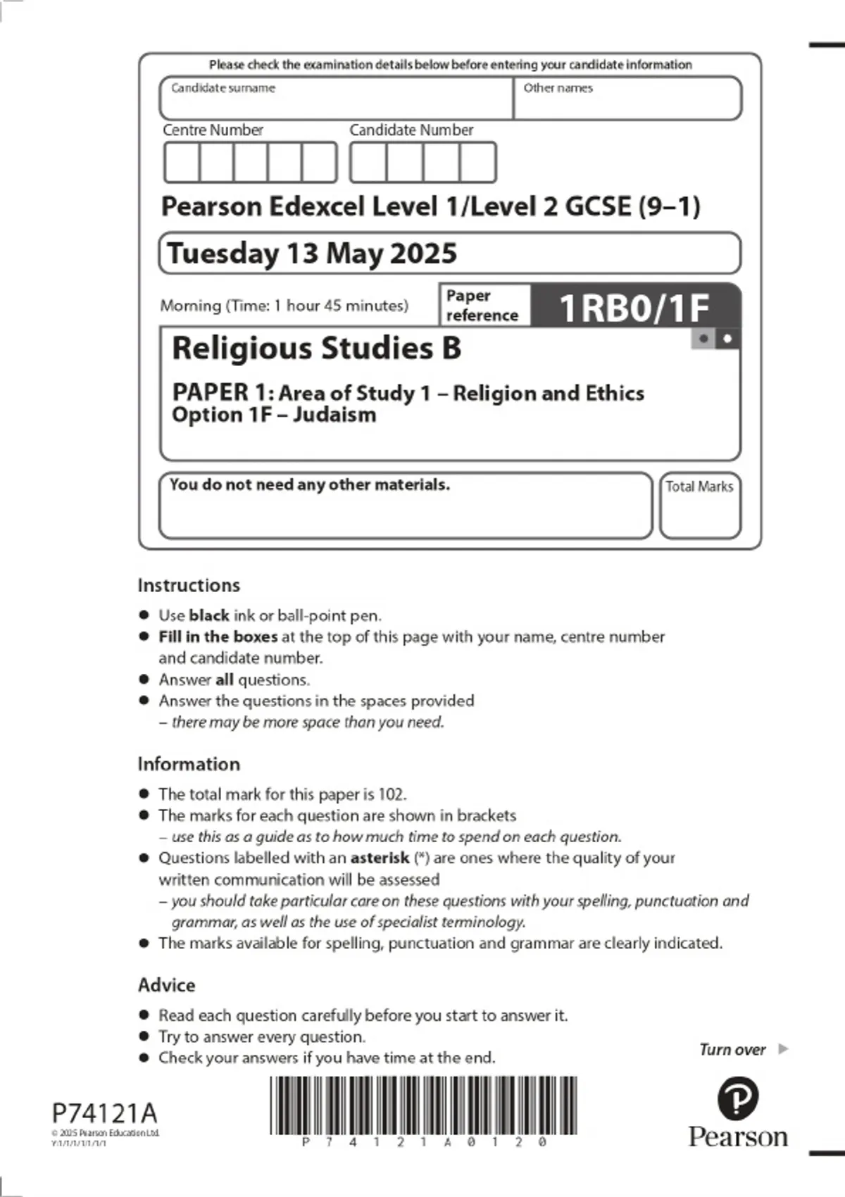 2025 Pearson Edexcel Level 1/Level 2 GCSE (9–1) Religious Studies B PAPER 1: Area of Study 1 – Religion and Ethics Option 1F – Judaism Combined Question Paper and Marking Scheme