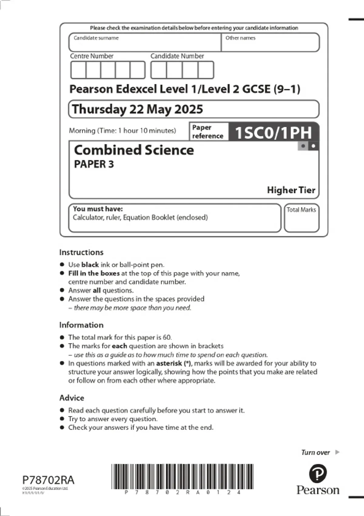 2025 Pearson Edexcel Level 1/Level 2 GCSE (9–1) Combined Science Paper 3 Higher Tier Combined Question Paper and Marking Scheme
