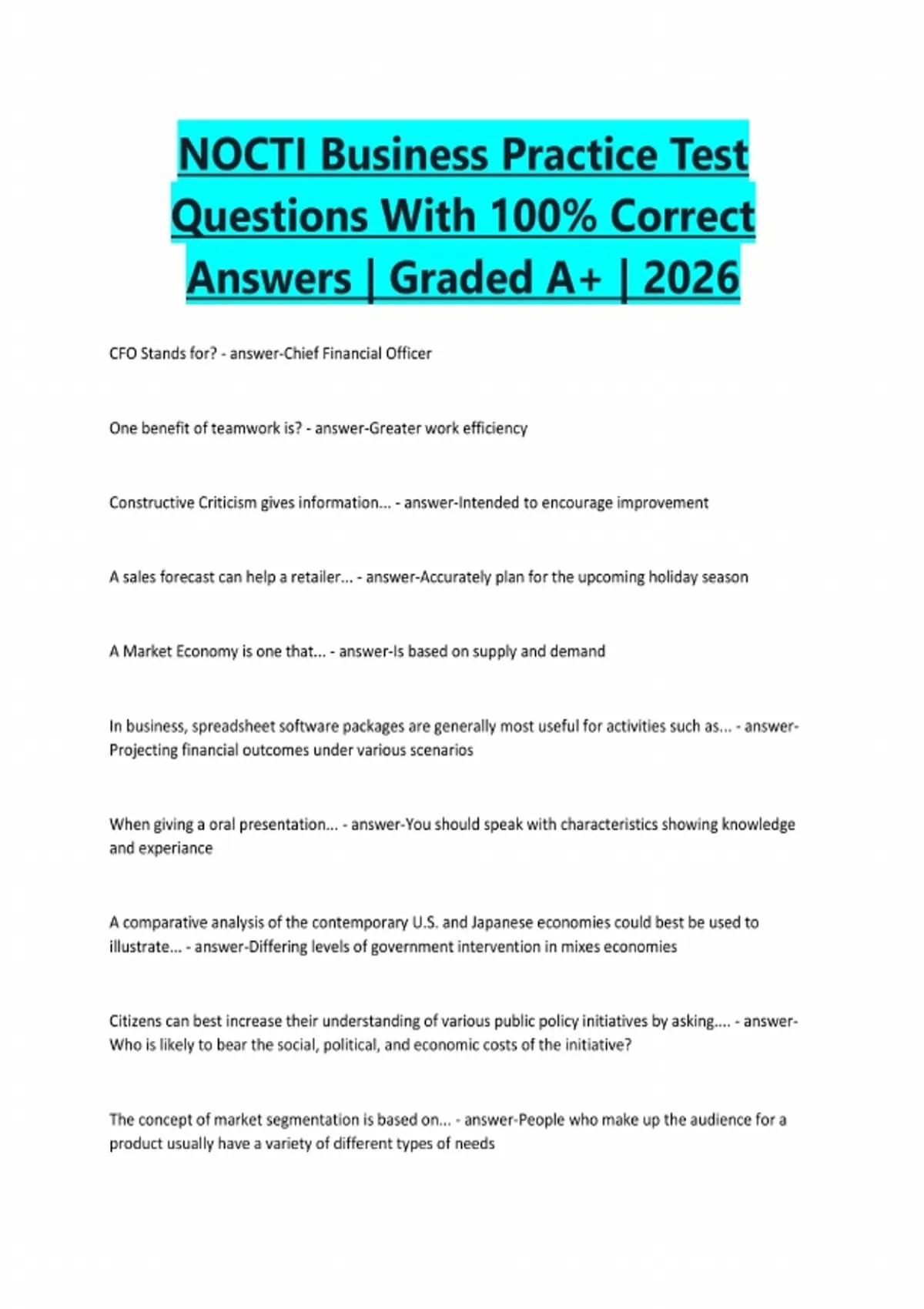 NOCTI Business Practice Test Questions With 100% Correct Answers | Graded A+ | 2026 CFO Stands for? - answer-Chief Financial Officer One benefit of teamwork is? - answer-Greater work efficiency Constructive Criticism gives information... - answer-Intended to encourage improvement A sales forecast can help a retailer... - answer-Accurately plan for the upcoming holiday season A Market Economy is one that... - answer-Is based on supply and demand In business, spreadsheet software packages are generally most useful for activities such as... - answerProjecting financial outcomes under various scenarios When giving a oral presentation... - answer-You should speak with characteristics showing knowledge and experiance A comparative analysis of the contemporary U.S. and Japanese economies could best be used to illustrate... - answer-Differing levels of government intervention in mixes economies Citizens can best increase their understanding of various public policy initiatives by asking.... - answerWho is likely to bear the social, political, and economic costs of the initiative? The concept of market segmentation is based on... - answer-People who make up the audience for a product usually have a variety of different types of needsRequiring a job applicant to answer (what question) would be a violation of federal law? - answer-Do you and your spouse plan to have children? A toy manufacturer plans to make 200,000 toy action figures to sell to wholesalers for $12 each. the cost of making and marketing the toys is $7.50 per unit. How many action figures must the toy manufacturer sell to break even? - answer-125,000 What should be the first step in performing marketing research? - answer-Define the research problem What would be considered a violation of an employee's rights? - answer-Conducting a credit or background check without the consent of the employee What best describes the role that venture capitalists generally play financing small businesses? - answerSupplying cash to businesses in return for a share of equity A primary characteristic of integrated software is that it enables users to: - answer-Transfer and manipulate data easily across multiple applications When sending a follow-up survey to consumers who have recently bought a product, it is most important to communicate what to survey recipients? - answer-The purpose of the survey and how its results will be used A company would most appropriately use primary sources such as focus groups or surveys to investigate: - answer-the likely consumer reaction to the introduction of a new line of products One of the servers at a small company has crashed three times in one day. When attempting to fix this problem, what should be the first step the Information Technology (IT) staff do first? - answerBrainstorm potential sources of the problem What situation uses a software program that is a violation of the End User License Agreement (EULA)? - answer-A teacher makes copies for his students of a single-license program purchased by the school