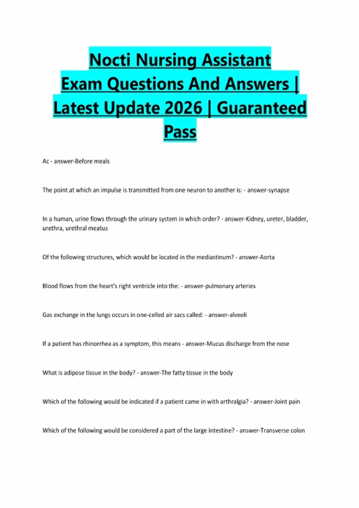 Nocti Nursing Assistant Exam Questions And Answers | Latest Update 2026 | Guaranteed Pass Ac - answer-Before meals The point at which an impulse is transmitted from one neuron to another is: - answer-synapse In a human, urine flows through the urinary system in which order? - answer-Kidney, ureter, bladder, urethra, urethral meatus Of the following structures, which would be located in the mediastinum? - answer-Aorta Blood flows from the heart's right ventricle into the: - answer-pulmonary arteries Gas exchange in the lungs occurs in one-celled air sacs called: - answer-alveoli If a patient has rhinorrhea as a symptom, this means - answer-Mucus discharge from the nose What is adipose tissue in the body? - answer-The fatty tissue in the body Which of the following would be indicated if a patient came in with arthralgia? - answer-Joint pain Which of the following would be considered a part of the large intestine? - answer-Transverse colonAdipose tissue is made of - answer-fat cells Of the following, which would a certified medical assistant typically be able to perform when assisting the physician in the exam room? - answer-Assist with minor procedures When washing hands, the three most important factors include: - answer-Friction, soap and warm running water In a healthcare facility, which of the following agencies or organizations work to set the standards for the safety of the employees? - answer-OSHA When a clinic writes a statement which sets the level of care that is to be provided, it would be considered which of the following? - answer-Standard In order for the healthcare facility to comply with the Health Insurance Portability and Accountability Act, each patient is to be given which of the following? - answer-Patient rights and privacy practices Typically, in an out-patient situation, which of the following is the main reason for the visit shown in the admission record sheet? - answer-The first listed diagnosis When would Korotkoff sounds be evaluated? - answer-Determine blood pressure If an infection is nosocomial, it means which of the following? - answer-Contracted within the hospital When pathogenic organisms are killed or destroyed, it is called which of the following - answerDisinfection If a patient is tested to determine the antibiotics that a pathogen is susceptible to, what type of test is being conducted? - answer-SensitivityIf a paper medical record needs to be corrected, which of the following would be an acceptable way to make the correction? - answer-Draw one line through the portion of the note that needsto be corrected and initial it. Making a note in one file that a paper is in another file is called - answer-cross-reference Which of the following abbreviations refer to intracranial pressure that might be seen documented in a patient's chart? - answer-ICP(intracranial pressure) Computer ___________ is considered the computer's physical equipment. - answer-Hardware Which of the following would describe a medical record that is categorized by date and time? - answerChronological Which of the following would EMR refer to? - answer-Electronic medical records A cystoscope is most commonly used by a specialist in: - answer-urology Which of the following would be used to indicate someone has taken a file from the file cabinet? - answer-Outguide Before referring a patient to another facility, a medical assistant should be sure to verify the patient's: - answer-insurance which would not be considered to be a part of effective communication? - answer-Noise the center of the brain that controls fear, aggression and anxiety? - answer-Amygdala Maslow's Hierarchy of Needs includes which of the following? - answer-Self-esteem