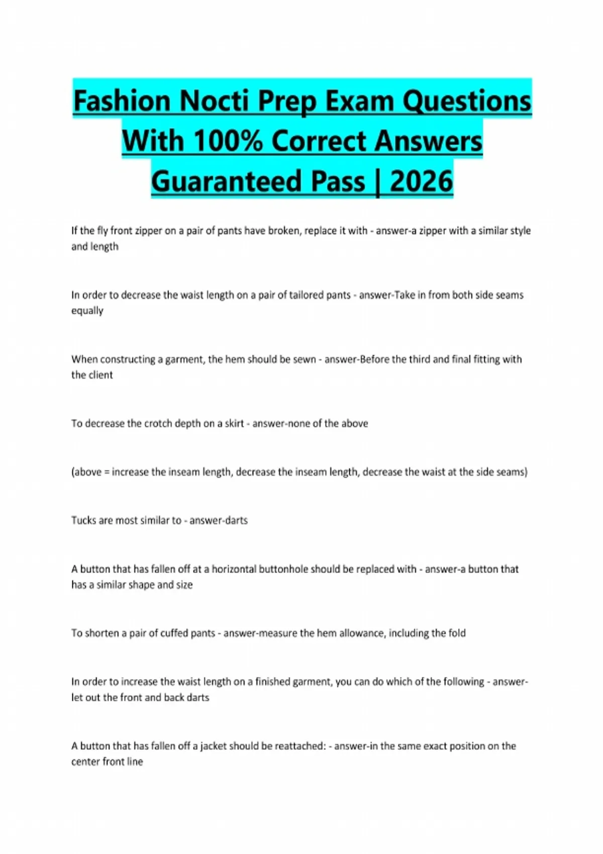 Fashion Nocti Prep Exam Questions With 100% Correct Answers Guaranteed Pass | 2026 If the fly front zipper on a pair of pants have broken, replace it with - answer-a zipper with a similar style and length In order to decrease the waist length on a pair of tailored pants - answer-Take in from both side seams equally When constructing a garment, the hem should be sewn - answer-Before the third and final fitting with the client To decrease the crotch depth on a skirt - answer-none of the above (above = increase the inseam length, decrease the inseam length, decrease the waist at the side seams) Tucks are most similar to - answer-darts A button that has fallen off at a horizontal buttonhole should be replaced with - answer-a button that has a similar shape and size To shorten a pair of cuffed pants - answer-measure the hem allowance, including the fold In order to increase the waist length on a finished garment, you can do which of the following - answerlet out the front and back darts A button that has fallen off a jacket should be reattached: - answer-in the same exact position on the center front lineThe standard seam allowance limits the maximum amount a garment can be altered to - answer-3 sizes To assess the fit of an unfinished garment that still has pins, the client should try on the garment - answer-with the right side out In order to increase the hem height on a skirt - answer-increase the hem allowance A double zipper pull - answer-is often found on denim garments If a garment must be taken in a total of 2-inches, take in each side seam __________ from the stitching line - answer-1/2 inch If the collar neckline is shorter than the shirt neckline, it will cause - answer-wrinkles to appear on the front and back shoulders In order to turn a tight fitted shirt into semi-fitted shirt: - answer-decrease the dart pick up Blending yarn involves: - answer-combining 2+ different fibers before spinning Which of the following is a synthetic fabric? - answer-Nylon Silk is a - answer-natural animal derived fabric Which fabric would have the largest thread count? - answer-fine silk charmeuse The most familiar and widely used fabric is - answer-cotton Which of the following indicate the right side of the fabric - answer-the side of the fabric with the most vibrant colorLinen is a - answer-natural plant derived fabric The right side of the fabric is the ________ of the fabric - answer-face Cotton is a _____ - answer-cellulosic fiber because it is plant derived Hand refers to the _____ of the fabric. - answer-feel Synthetic fibers are - answer-created using chemicals Plaids that are symmetrical lengthwise and crosswise are - answer-even The selvage of the fabric is the edfe of the fabric that is - answer-parallel to the lengthwise grain Colorfast garments are - answer-dyed with colors that will not wash out One of the most popular fabric widths is - answer-60 inch Stain resistance means - answer-Fibers are made less absorbent, making it easier to lift off or sponge away spills of food, water, and other substances A 3 ply yarn means - answer-3 yarns are twisted together A vegetable based finish applied to cloth to give fabrics more firmness and body is called - answer-starch A wool fabric made of long, combed fibers woven with a smooth, crisp surface is called - answer worsted wool