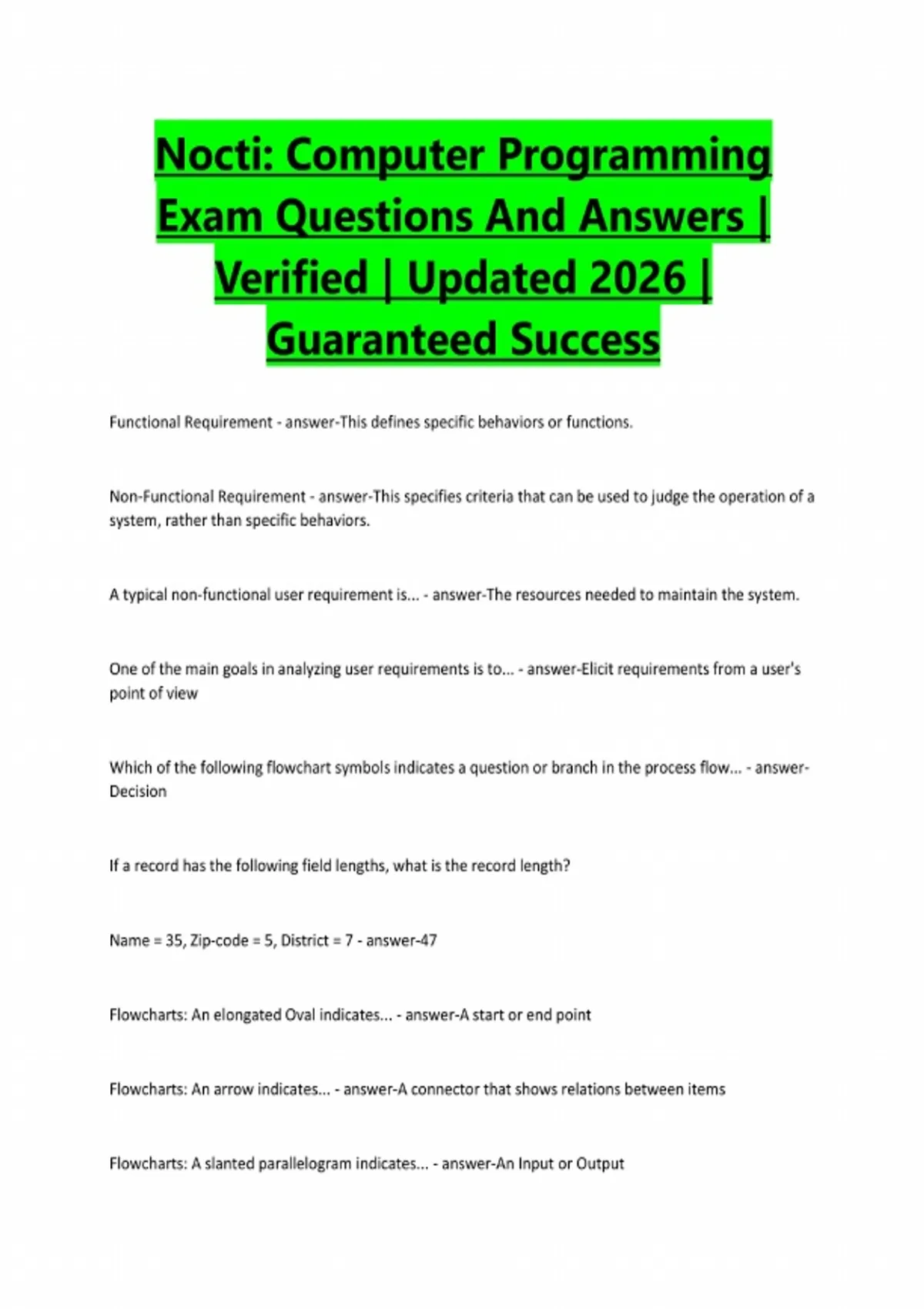 Nocti: Computer Programming Exam Questions And Answers | Verified | Updated 2026 | Guaranteed Success Functional Requirement - answer-This defines specific behaviors or functions. Non-Functional Requirement - answer-This specifies criteria that can be used to judge the operation of a system, rather than specific behaviors. A typical non-functional user requirement is... - answer-The resources needed to maintain the system. One of the main goals in analyzing user requirements is to... - answer-Elicit requirements from a user's point of view Which of the following flowchart symbols indicates a question or branch in the process flow... - answerDecision If a record has the following field lengths, what is the record length? Name = 35, Zip-code = 5, District = 7 - answer-47 Flowcharts: An elongated Oval indicates... - answer-A start or end point Flowcharts: An arrow indicates... - answer-A connector that shows relations between items Flowcharts: A slanted parallelogram indicates... - answer-An Input or OutputFlowcharts: A rectangle indicates... - answer-A representation of a process Flowcharts: A diamond indicates... - answer-A Decision In Programming interface data files, if the length of the fields is not known, a common format for the data is... - answer-Delimited Delimited fields are separated by... - answer-Commas Fixed Length fields are separated by... - answer-Positions of the data The source document and _____ should follow the same order. - answer-Input screen design The implementation phase consists of coding, testing, and... - answer-Integration The order of the SDLC is... - answer-Design, Implementation, Testing, Evolution, Requirement Analysis Reviewing specifications is the ____ step in writing a computer program. - answer-First Coding is the _____ step in writing a compute rprogram - answer-Third One example of scripting (text processing) language is... - answer-Perl Which of the following enables the use of "plain English" queries? - answer-SQL What is a correct name for a variable? - answer-State_Zipcode What is an incorrect name for a variable? - answer-State+ZipcodeWhat type of variable contains text? - answer-String An example of String... - answer-"Hello World" What type of variable contains basic integer data? - answer-Integer An example of an Integer... - answer-95 What type of variable is heavily related to the 'true' and 'false' denominations of data? - answer-Boolean An example of a Boolean... - answer-Status = True An example of loop structure is... - answer-DO UNTIL What type of variable is unrounded and uses values like "2.7" and "5.6"? - answer-Double An example of a Double... - answer-3. Why is the following expression invalid? A = 10 + "New Data" - answer-Data types are mixed An example of an integer variable... - answer--37 The following BASIC control statement FOR X = 25 TO 35 will cause the... - answer-Following statement to be executed 11 times