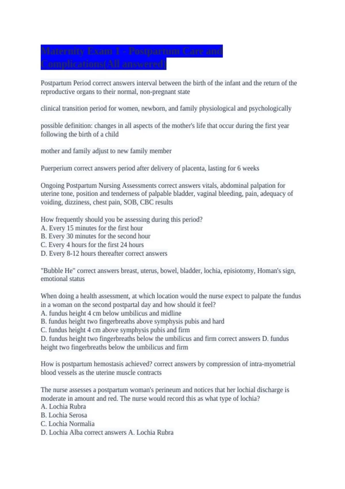 Maternity Exam 1 - Postpartum Care and Complications(All answered)