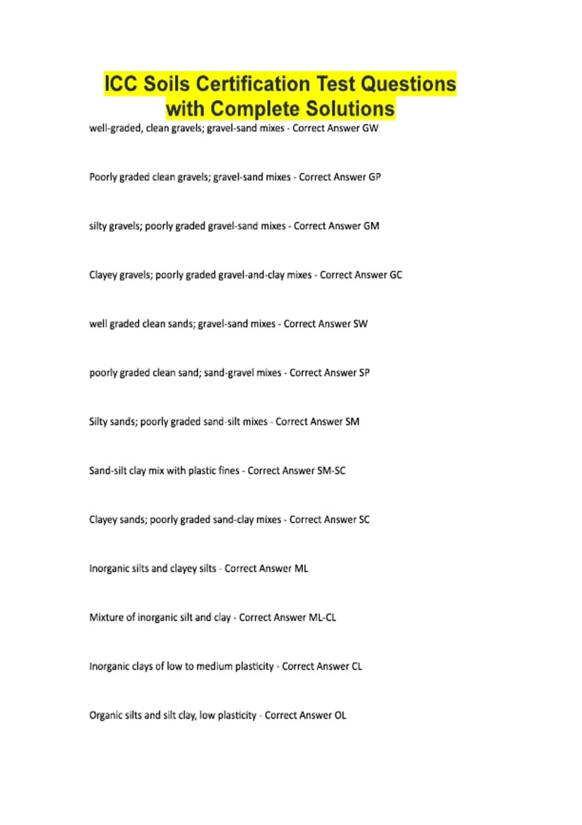 ICC Soils Certification Test Questions with Complete Solutions well-graded, clean gravels; gravel-sand mixes - Correct Answer GW Poorly graded clean gravels; gravel-sand mixes - Correct Answer GP silty gravels; poorly graded gravel-sand mixes - Correct Answer GM Clayey gravels; poorly graded gravel-and-clay mixes - Correct Answer GC well graded clean sands; gravel-sand mixes - Correct Answer SW poorly graded clean sand; sand-gravel mixes - Correct Answer SP Silty sands; poorly graded sand-silt mixes - Correct Answer SM Sand-silt clay mix with plastic fines - Correct Answer SM-SC Clayey sands; poorly graded sand-clay mixes - Correct Answer SC Inorganic silts and clayey silts - Correct Answer ML Mixture of inorganic silt and clay - Correct Answer ML-CL Inorganic clays of low to medium plasticity - Correct Answer CL Organic silts and silt clay, low plasticity - Correct Answer OL inorganic clayey silts, el