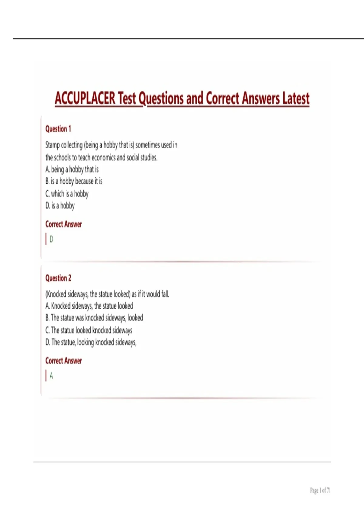ACCUPLACER Test Questions and Correct Answers Latest