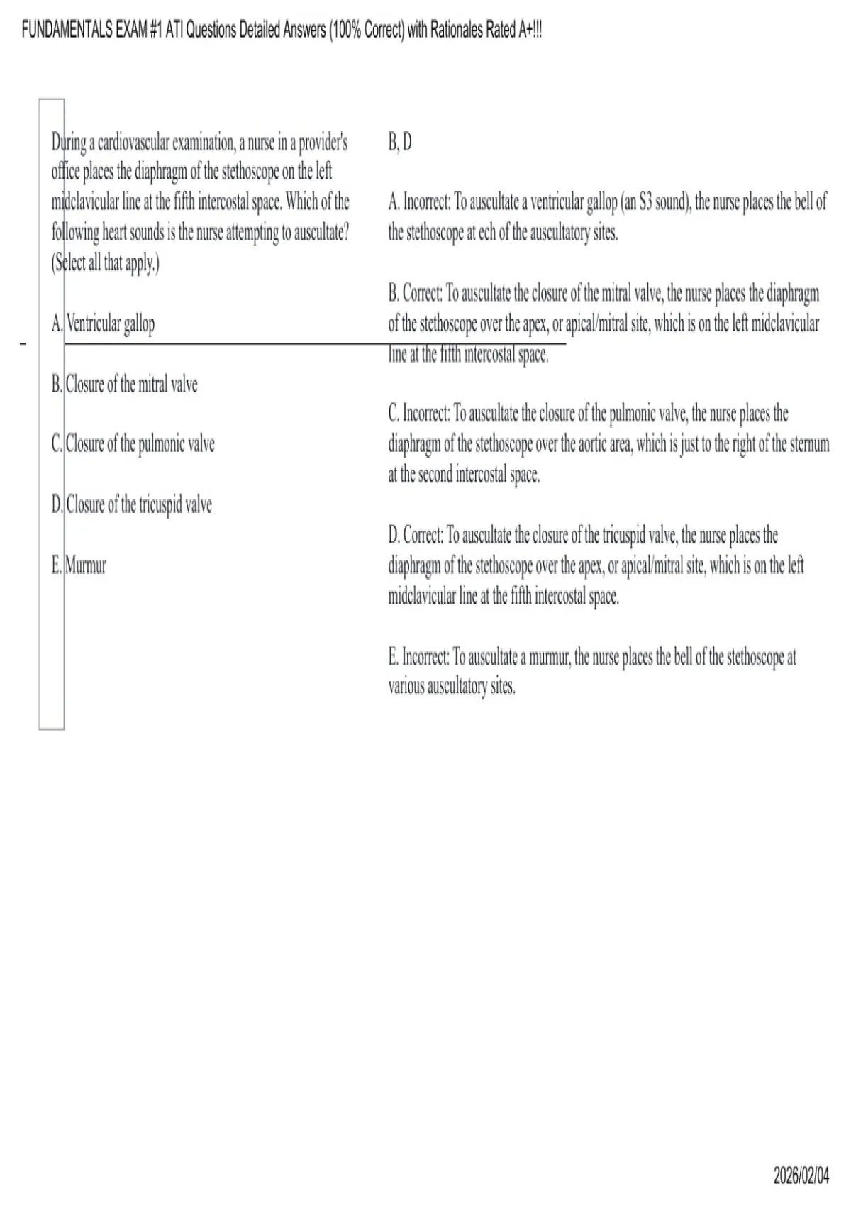 E. Incorrect: To auscultate a murmur, the nurse places the bell of the stethoscope at