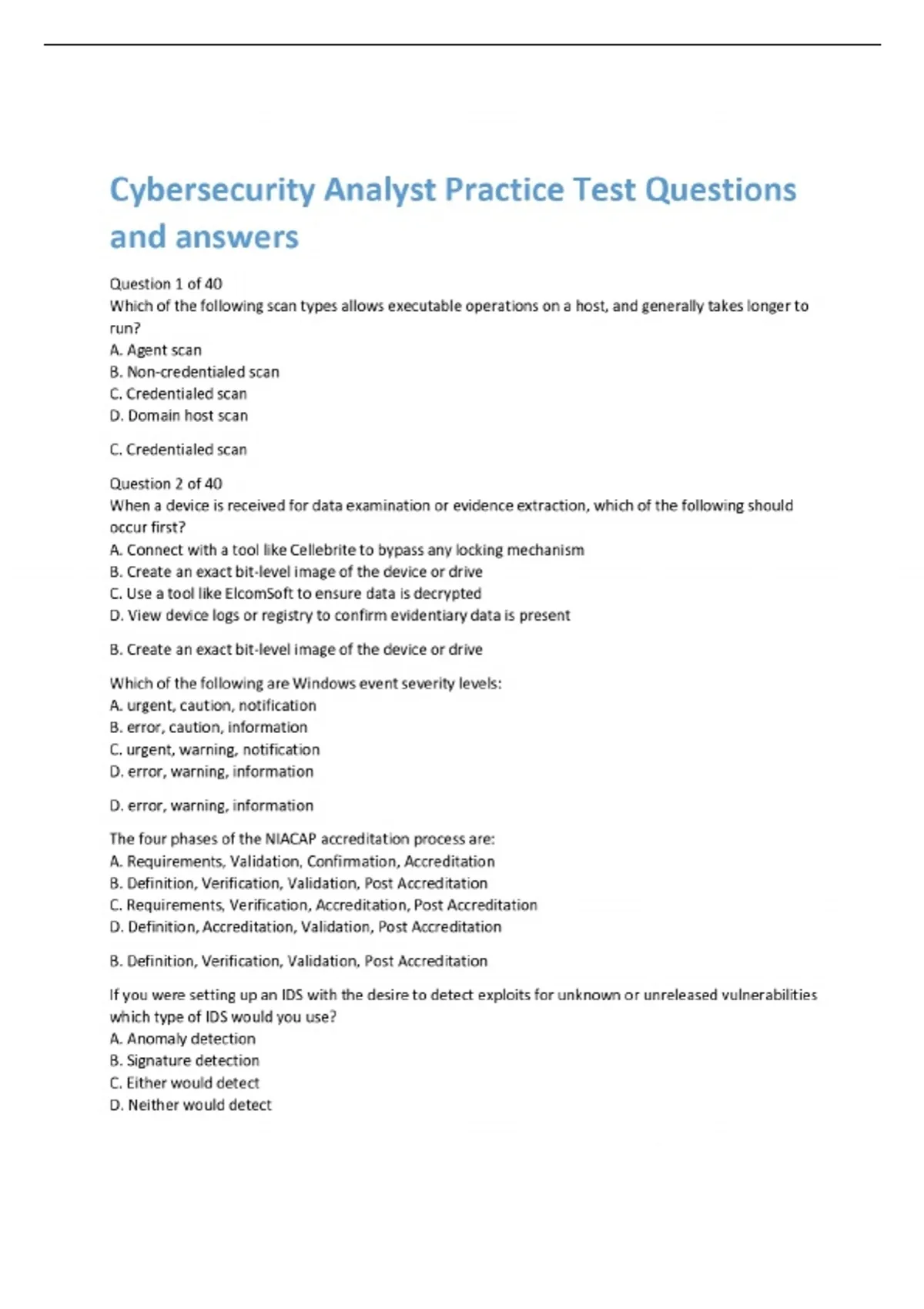 Cybersecurity Analyst Practice Test Questions and answers Question 1 of 40 Which of the following scan types allows executable operations on a host, and generally takes longer to run? A. Agent scan B. Non-credentialed scan C. Credentialed scan D. Domain host scan C. Credentialed scan Question 2 of 40 When a device is received for data examination or evidence extraction, which of the following should occur first? A. Connect with a tool like Cellebrite to bypass any locking mechani