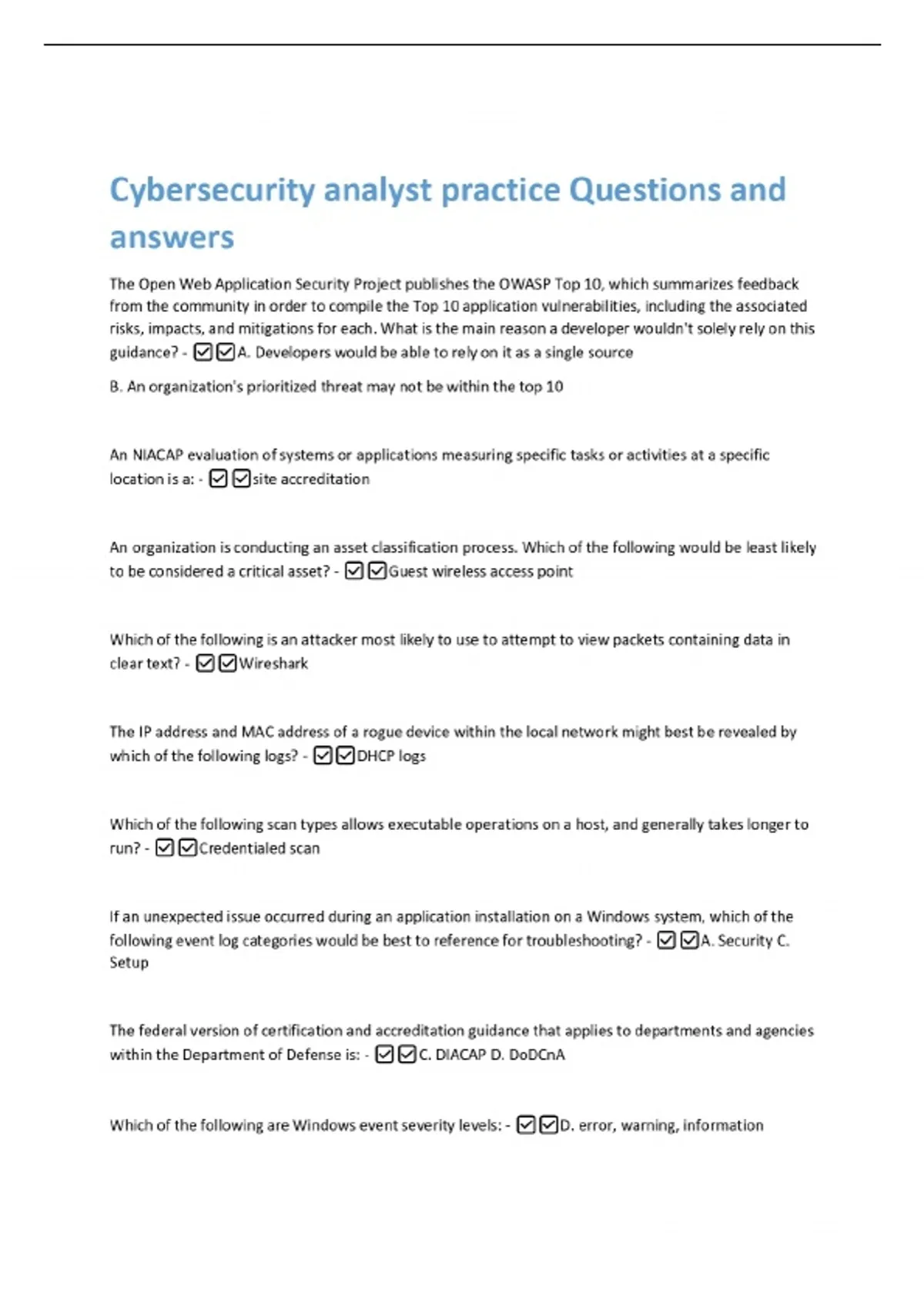 Cybersecurity analyst practice Questions and answers The Open Web Application Security Project publishes the OWASP Top 10, which summarizes feedback from the community in order to compile the Top 10 application vulnerabilities, including the associated risks, impacts, and mitigations for each. What is the main reason a developer wouldn't solely rely on this guidance? - A. Developers would be able to rely on it as a single source B. An organization's prioritized threat may not be within the top 10