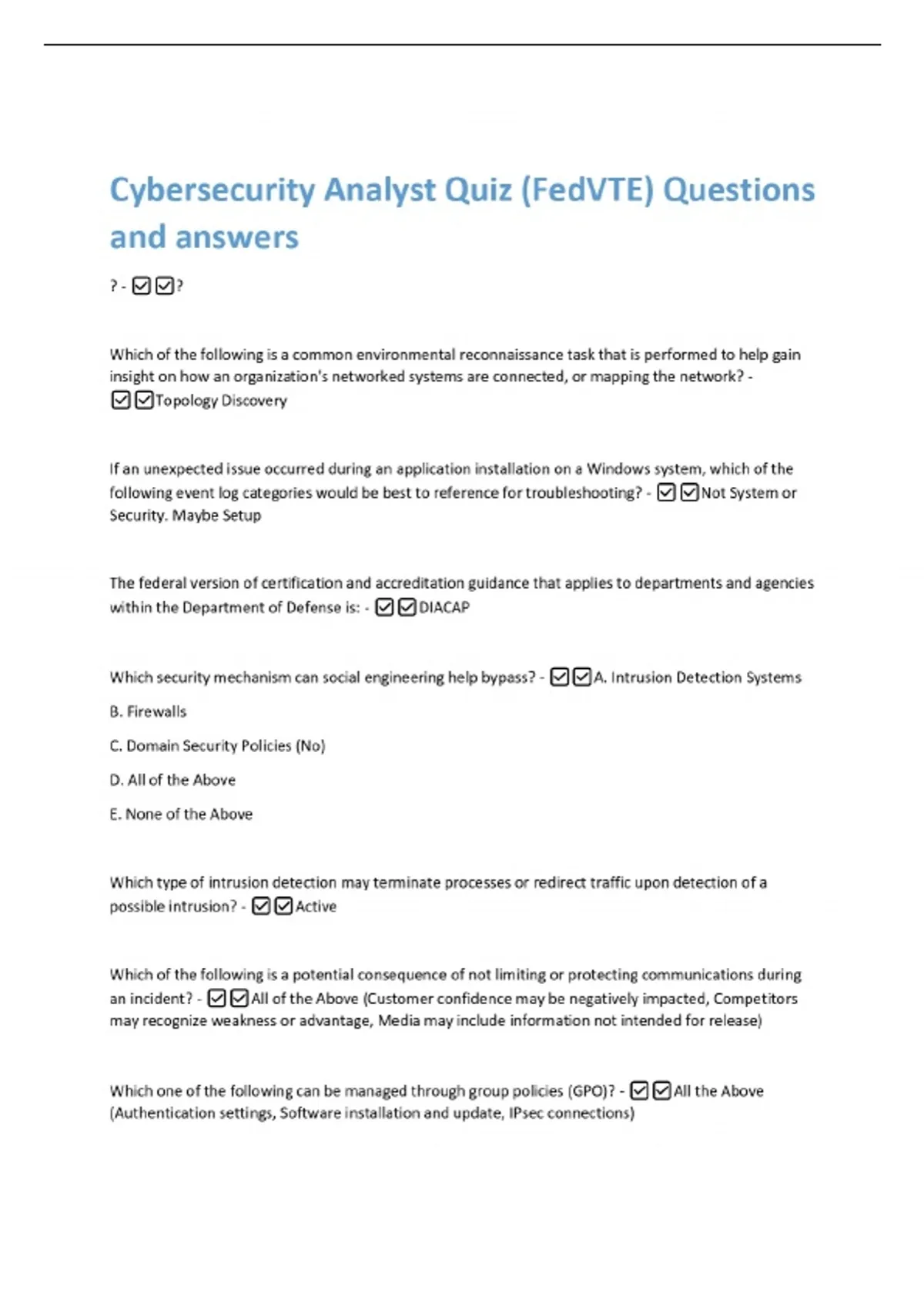 Cybersecurity Analyst Quiz (FedVTE) Questions and answers ? - ? Which of the following is a common environmental reconnaissance task that is performed to help gain insight on how an organization's networked systems are connected, or mapping the network? - Topology Discovery If an unexpected issue occurred during an application installation on a Windows system, which of the following event log categories would be best to reference for troubleshooting? - Not System or Security. Maybe Setup
