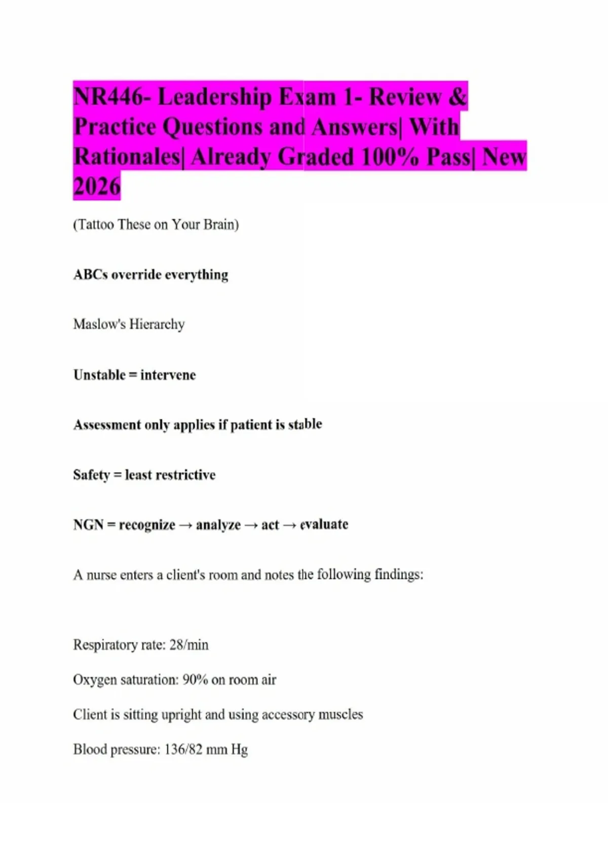 NR446- Leadership Exam 1- Review & Practice Questions and Answers| With Rationales| Already Graded 100% Pass| New 2026 (Tattoo These on Your Brain) ABCs override everything Maslow's Hierarchy Unstable = intervene Assessment only applies if patient is stable Safety = least restrictive NGN = recognize → analyze → act → evaluate A nurse enters a client's room and notes the following findings: Respiratory rate: 28/min Oxygen saturation: 90% on room air Client is sitting upright and using accessory muscles Blood pressure: 136/82 mm Hg Heart rate: 104 bpm Which action should the nurse take first? A. Obtain a STAT chest x-ray B. Apply supplemental oxygen C. Notify the provider D. Obtain a full set of vital signs Correct Answer: B. Apply supplemental oxygen Rationale -Breathing is compromised (tachypnea, accessory muscle use, borderline SpO₂). -The nurse does not delay intervention to collect more data when oxygenation is threatened. -Applying oxygen is within nursing scope and addresses immediate safety. Why the others are wrong: -A: Diagnostic tests come after stabilization. -C: The nurse intervenes before calling. -D: Enough data already shows a breathing problem.