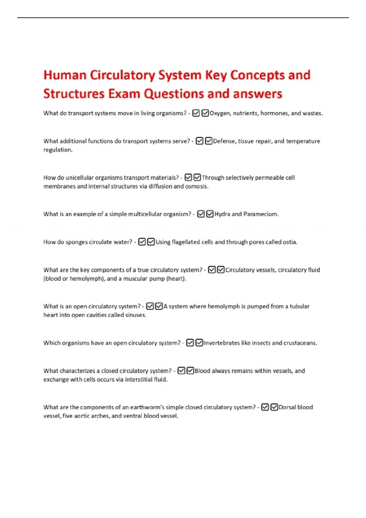 Human Circulatory System Key Concepts and Structures Exam Questions and answers What do transport systems move in living organisms? - Oxygen, nutrients, hormones, and wastes. What additional functions do transport systems serve? - Defense, tissue repair, and temperature regulation. How do unicellular organisms transport materials? - Through selectively permeable cell membranes and internal structures via diffusion and osmosis. What is an example of a simple multicellular organism? - Hydra and Paramecium. How do sponges circulate water? - Using flagellated cells and through pores called ostia. What are the key components of a true circulatory system? - Circulatory vessels, circulatory fluid (blood or hemolymph), and a muscular pump (heart).
