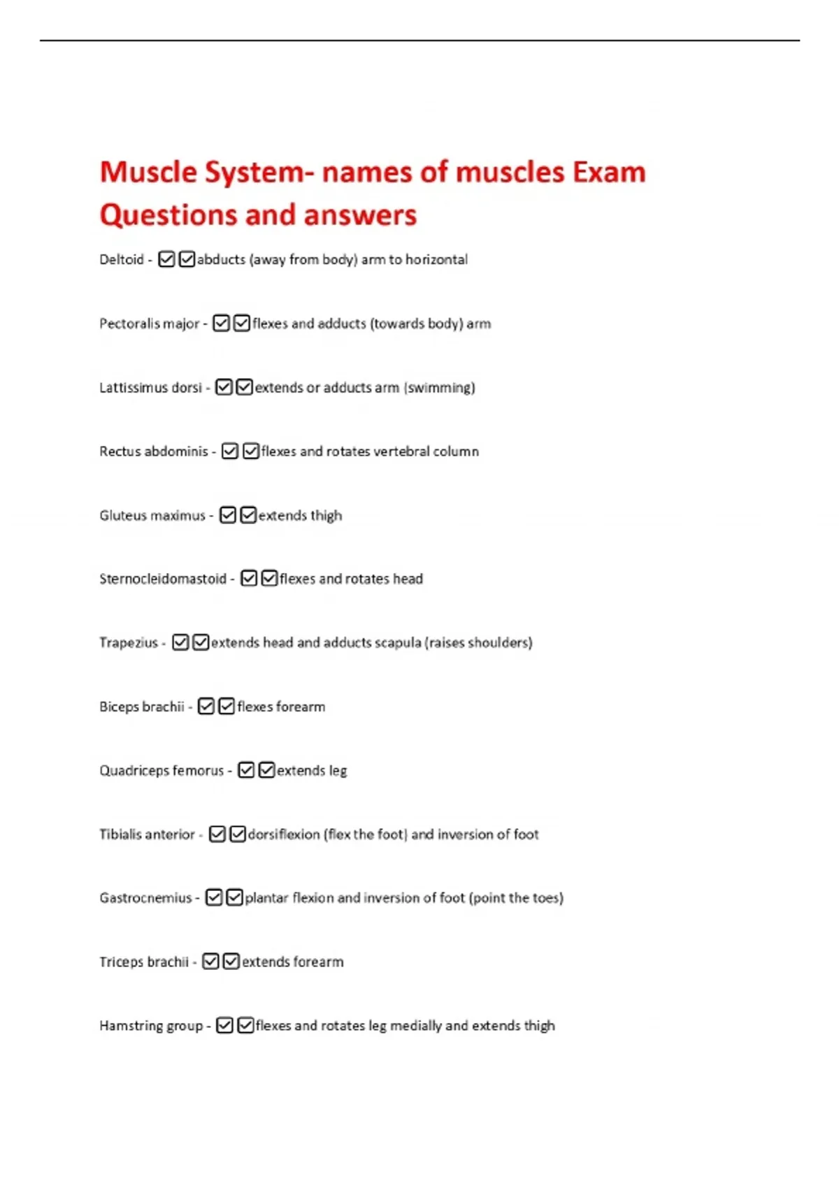 Muscle System- names of muscles Exam Questions and answers Deltoid - abducts (away from body) arm to horizontal Pectoralis major - flexes and adducts (towards body) arm Lattissimus dorsi - extends or adducts arm (swimming) Rectus abdominis - flexes and rotates vertebral column Gluteus maximus - extends thigh Sternocleidomastoid - flexes and rotates head Trapezius - extends head and adducts scapula (raises shoulders) Biceps brachii - flexes forearm Quadriceps femorus - extends leg Tibialis anterior - dorsiflexion (flex the foot) and inversion of foot