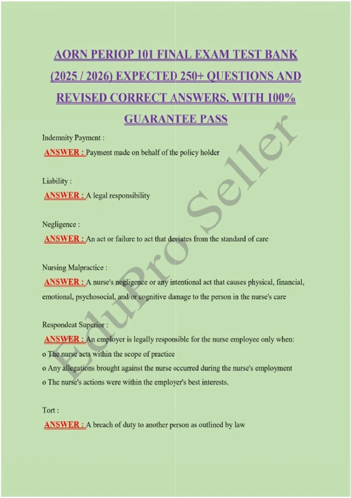 AORN PERIOP 101 FINAL EXAM TEST BANK
