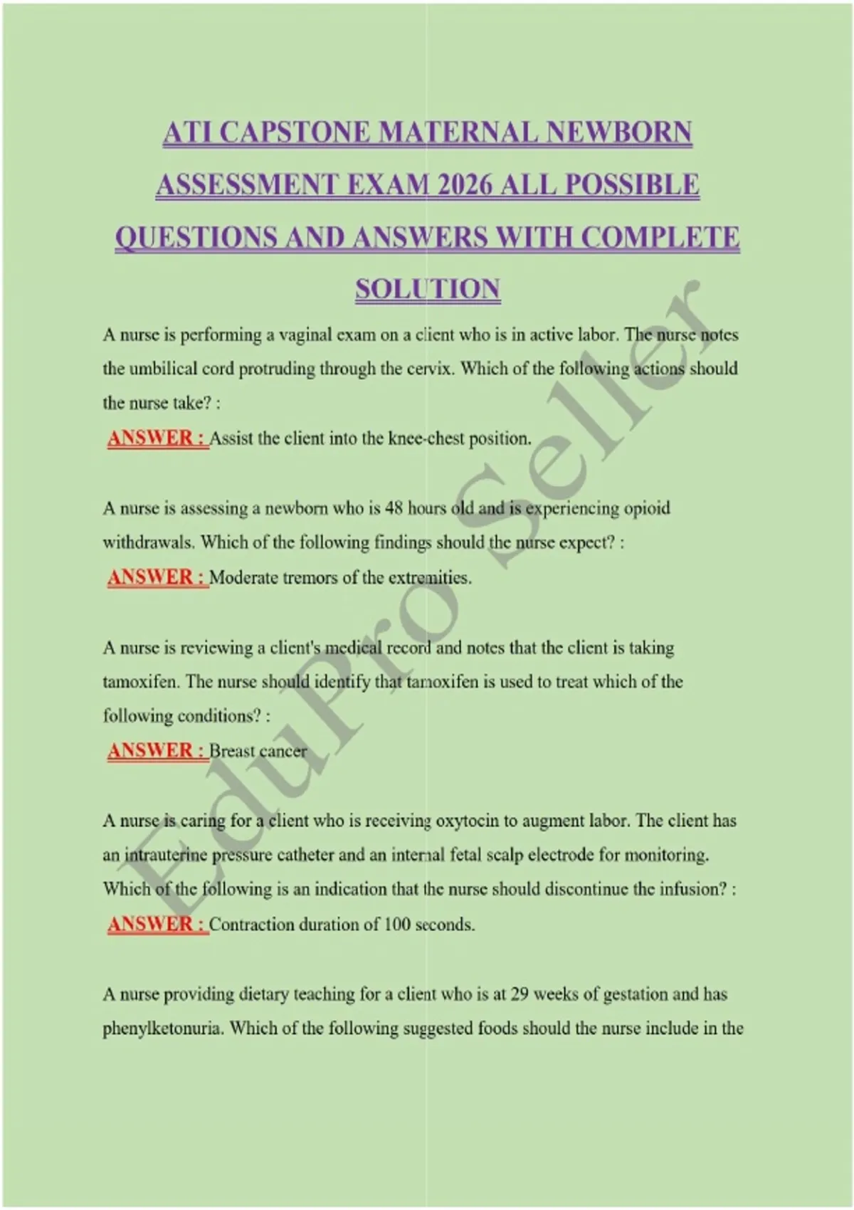 ATI CAPSTONE MATERNAL NEWBORN ASSESSMENT EXAM 2026 with verified answers
