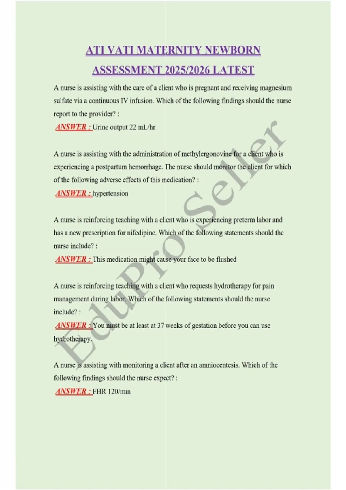 ATI VATI MATERNITY NEWBORN ASSESSMENT 2026 LATEST WITH CORRECT ANSWERS