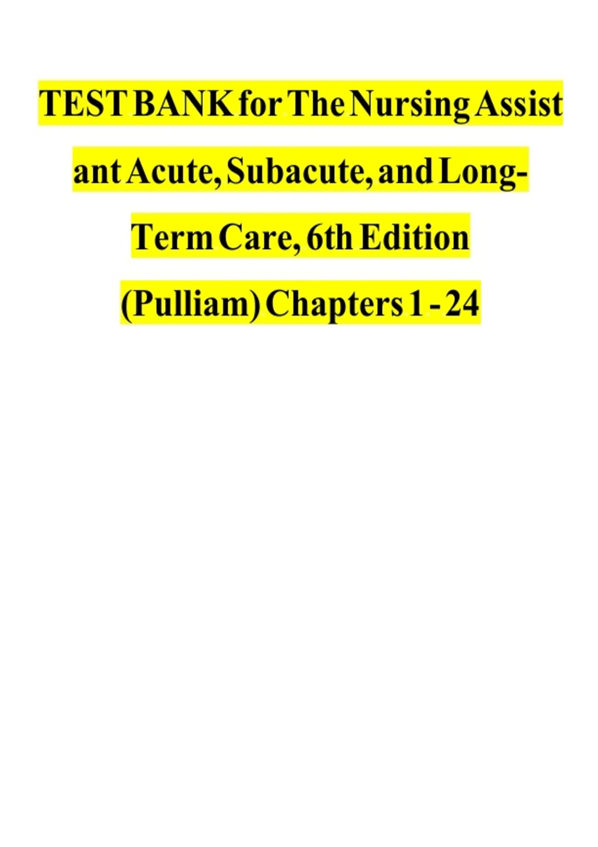 , Test Bank - The Nursing Assistant: Acute, Subacute, and Long-Term Care, 6e (Pulliam, 2020)