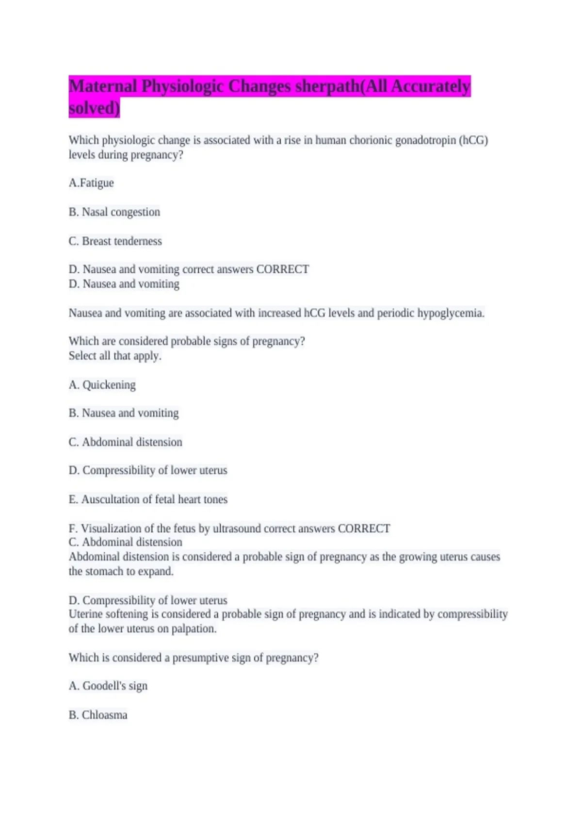 F. Visualization of the fetus by ultrasound correct answers CORRECT