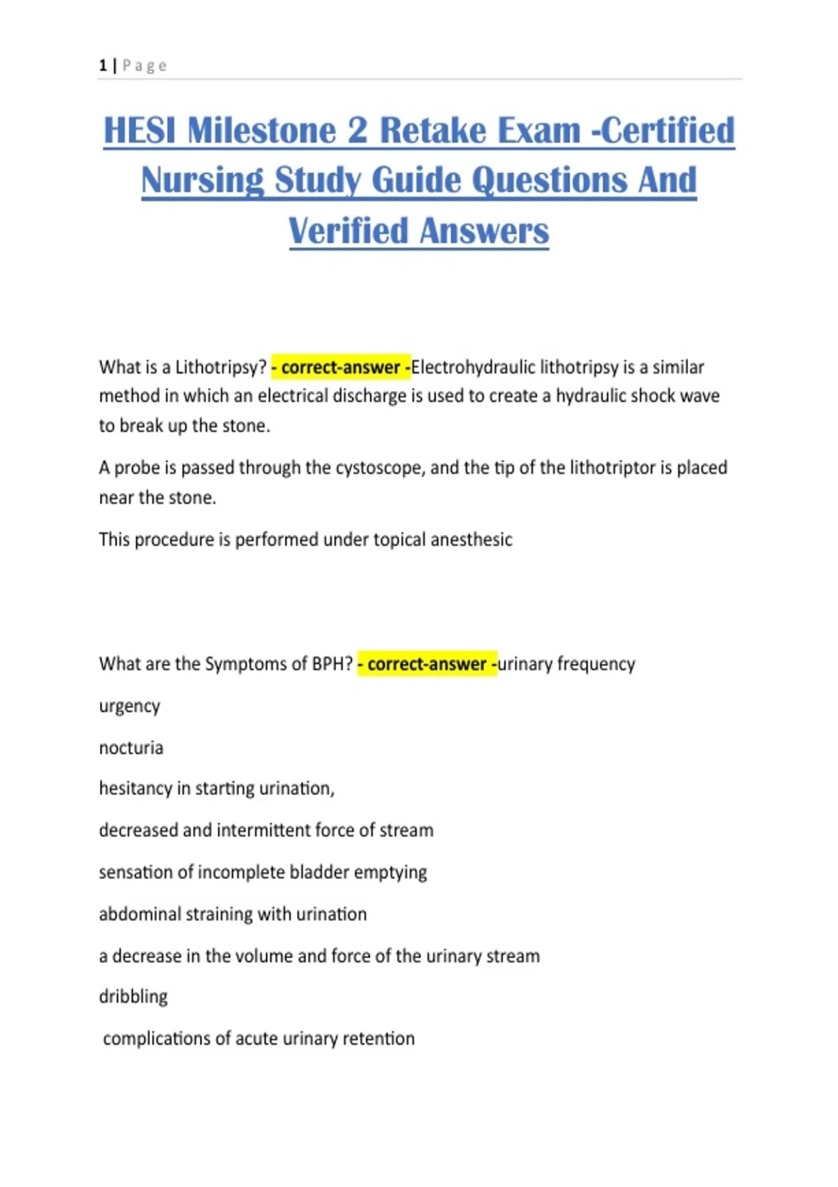 HESI Milestone 2 Retake Exam -Certified Nursing Study Guide Questions And Verified Answers