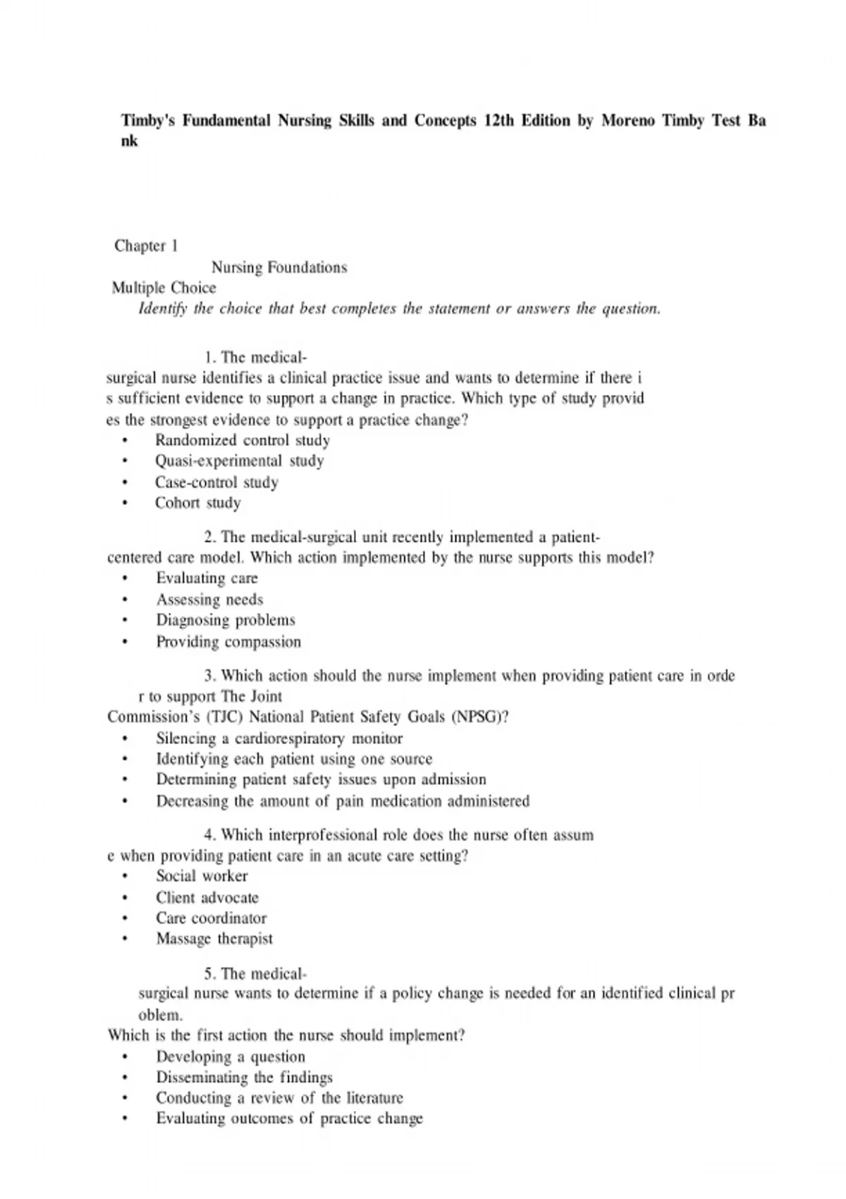 Enhance your nursing education with the Test Bank for Timby's Fundamental Nursing Skills and Concepts, 12th Edition by Moreno. This comprehensive test bank offers a diverse collection of questions and answers designed to reinforce key nursing skills and concepts. Ideal for nursing students and educators, this resource is essential for exam preparation and mastering fundamental practices in nursing. Key Features: Extensive coverage of essential nursing skills and concepts Varied question formats to assess comprehension and application Supports effective study strategies and enhances exam readiness Ideal resource for students pursuing studies in nursing and healthcare Prepare effectively for your assessments and deepen your understanding of fundamental nursing concepts with this invaluable test bank.