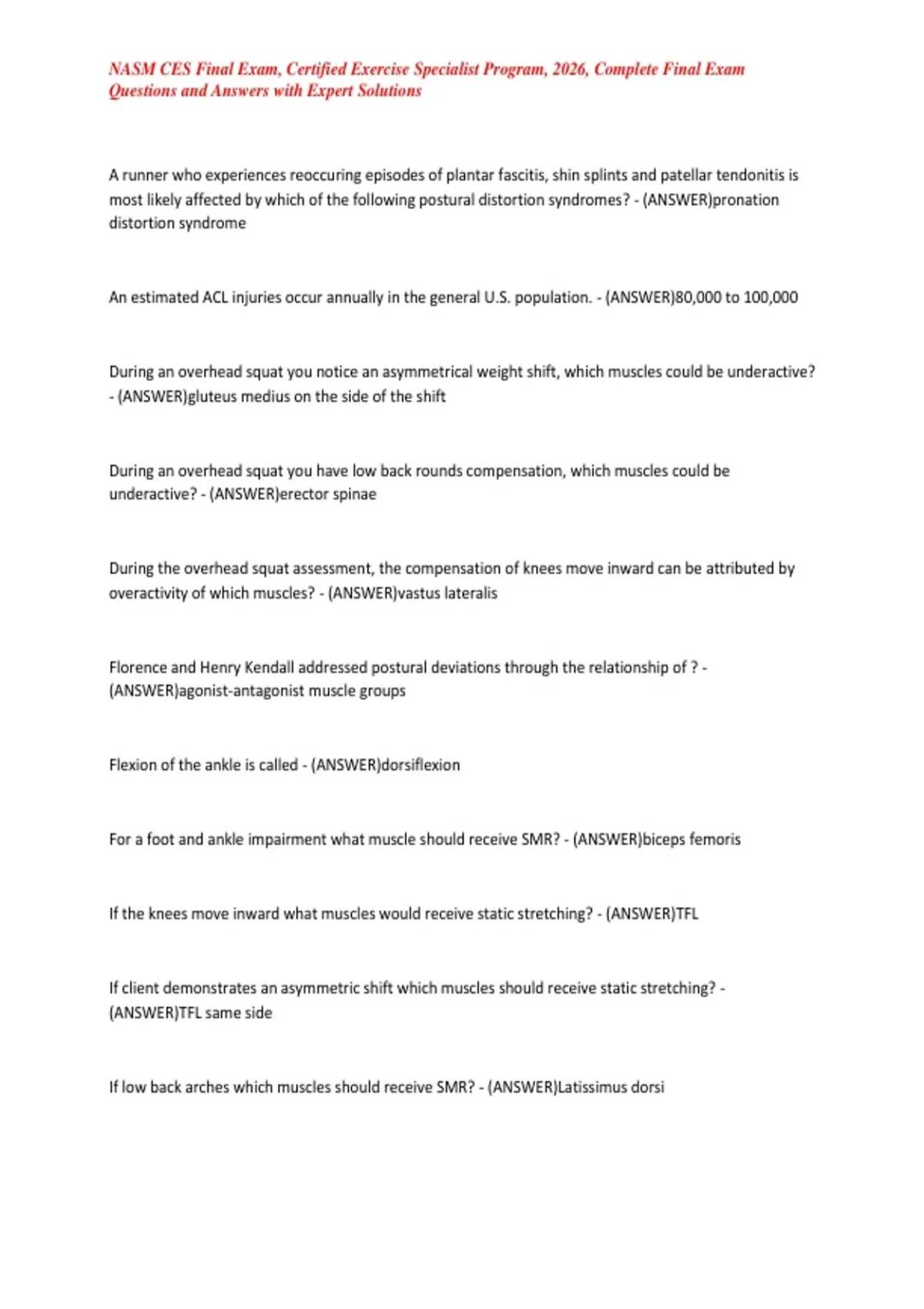 NASM CES Final Exam, Certified Exercise Specialist Program, 2026, Complete Final Exam Questions and Answers with Expert Solutions