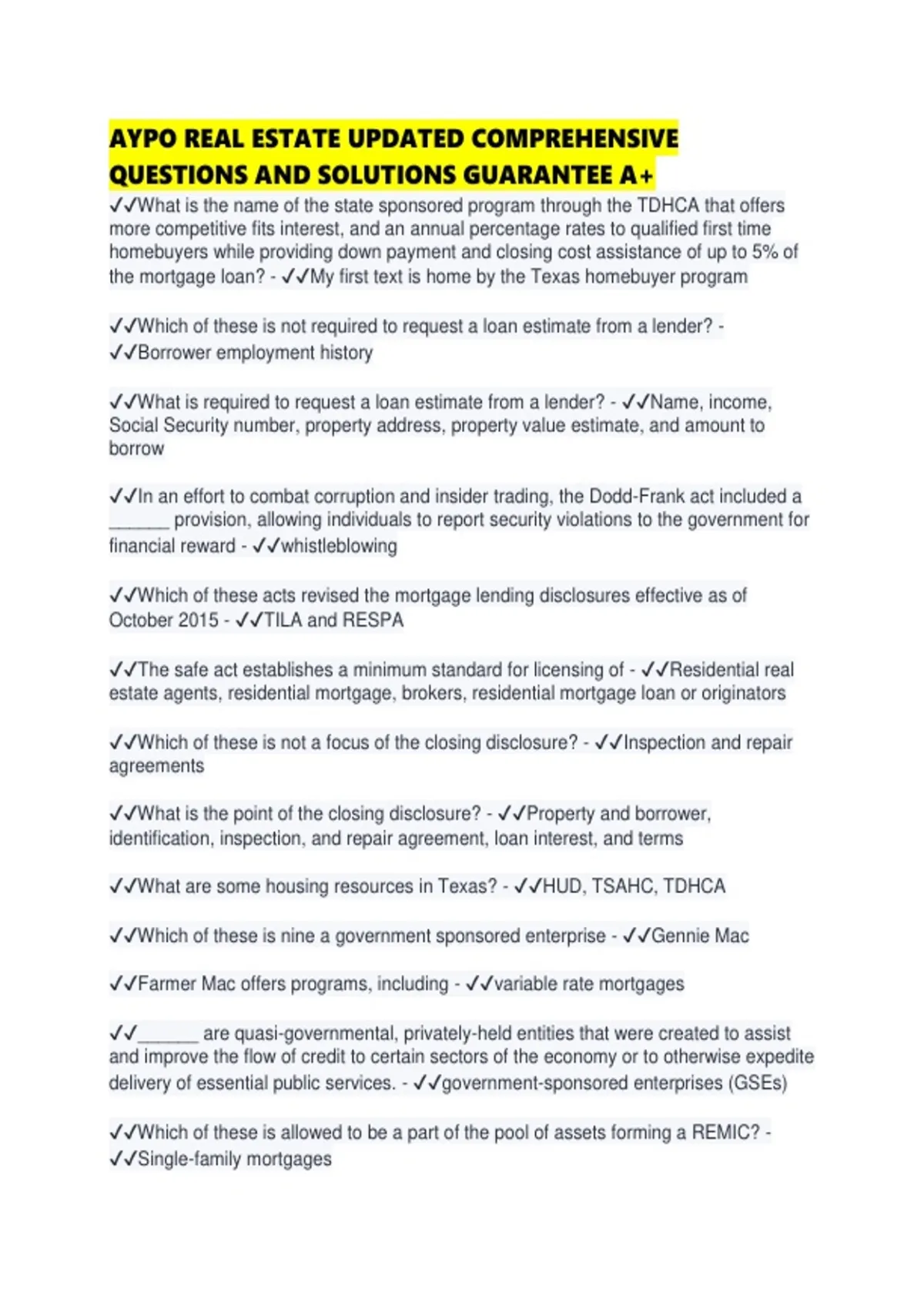 AYPO REAL ESTATE UPDATED COMPREHENSIVE QUESTIONS AND SOLUTIONS GUARANTEE