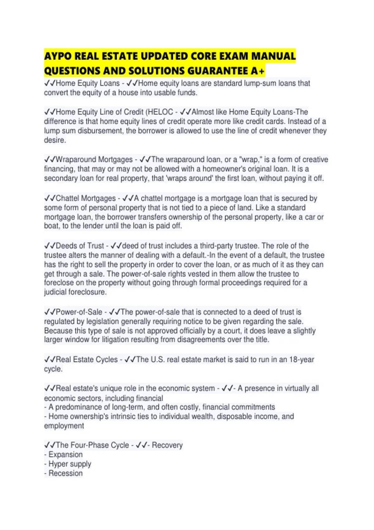 AYPO REAL ESTATE UPDATED CORE EXAM MANUAL QUESTIONS AND SOLUTIONS GUARANTEE