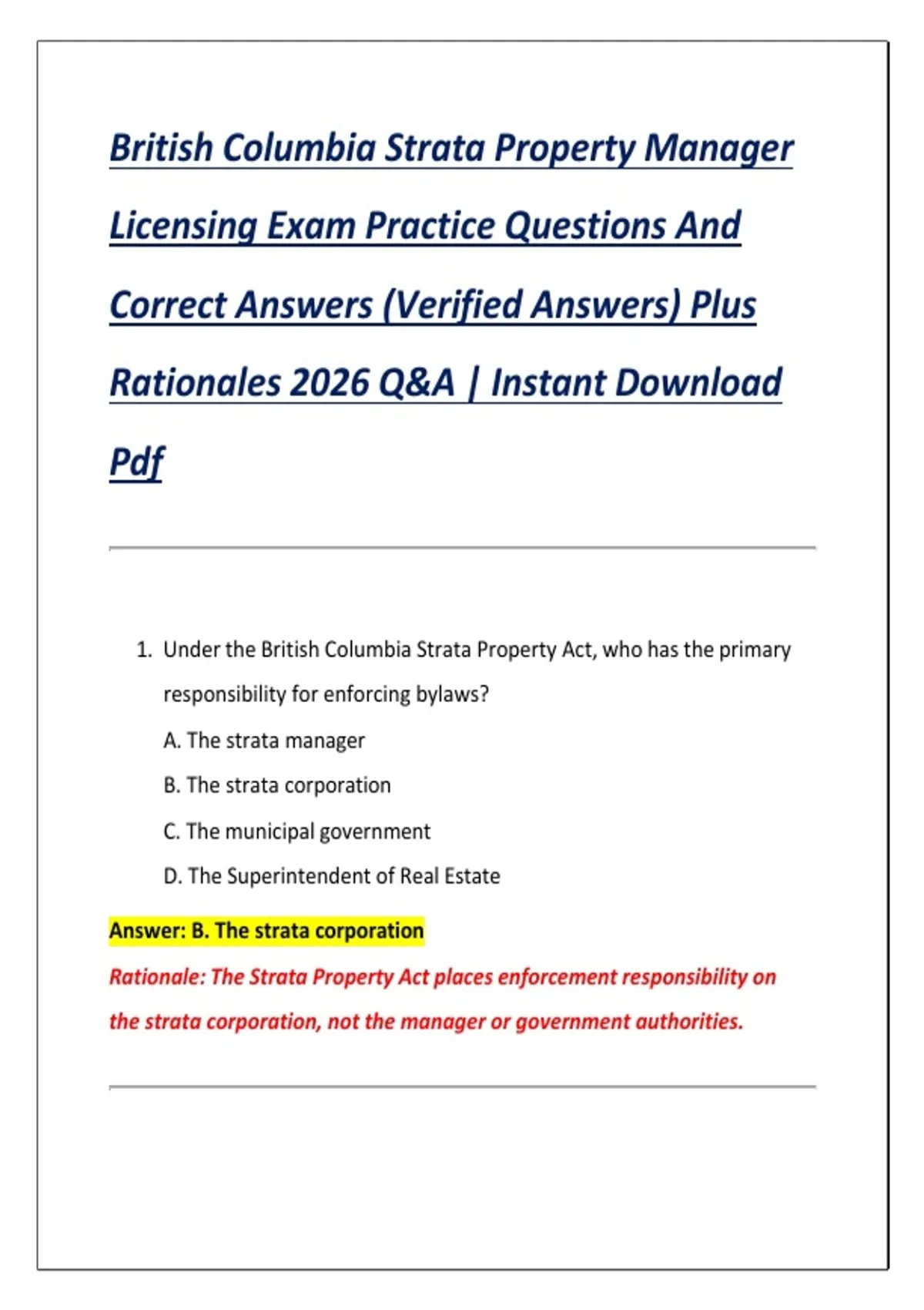 British Columbia Strata Property Manager Licensing Exam Practice Questions | Verified Answers & Rationales