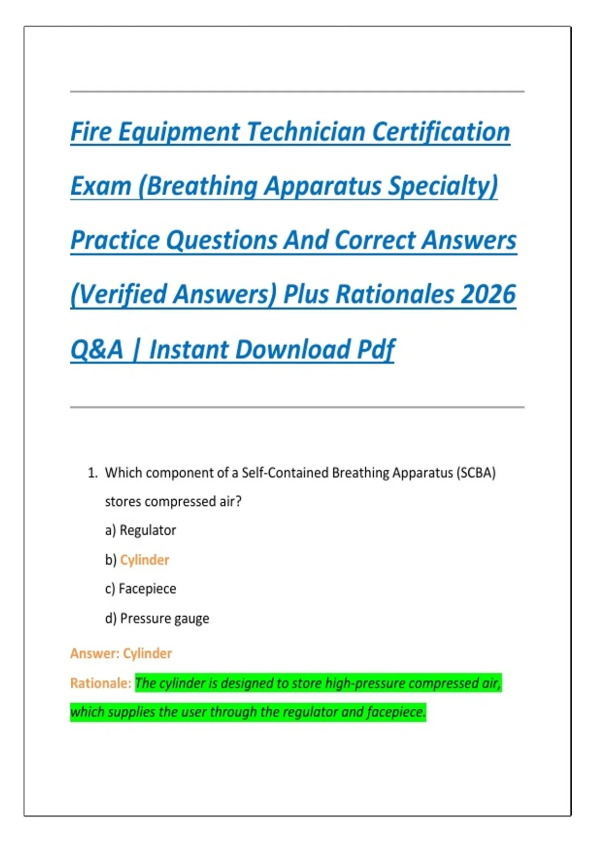 Fire Equipment Technician Certification Exam (Breathing Apparatus Specialty) Practice Questions And Correct Answers (Verified Answers) Plus Rationales 2026 Q&A | Instant Download Pdf