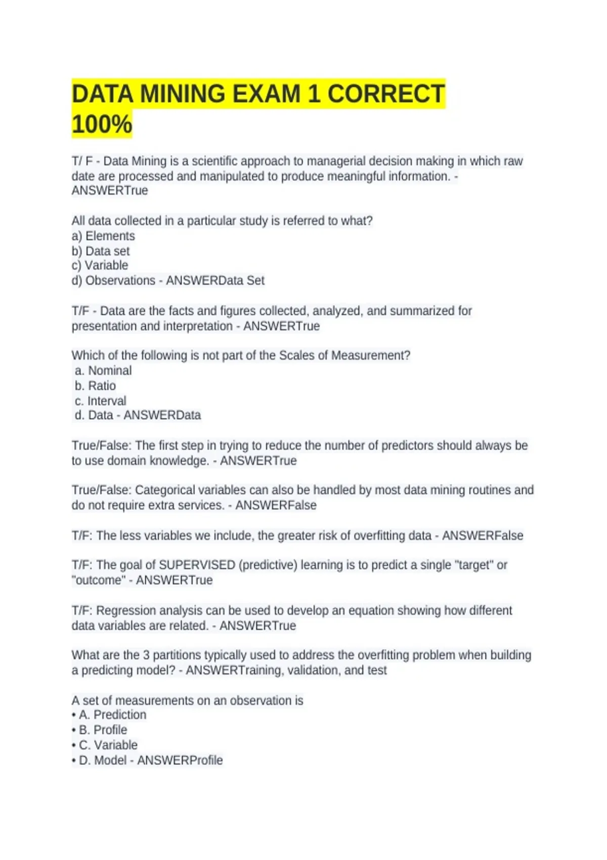 T/F: The less variables we include, the greater risk of overfitting data - ANSWERFalse