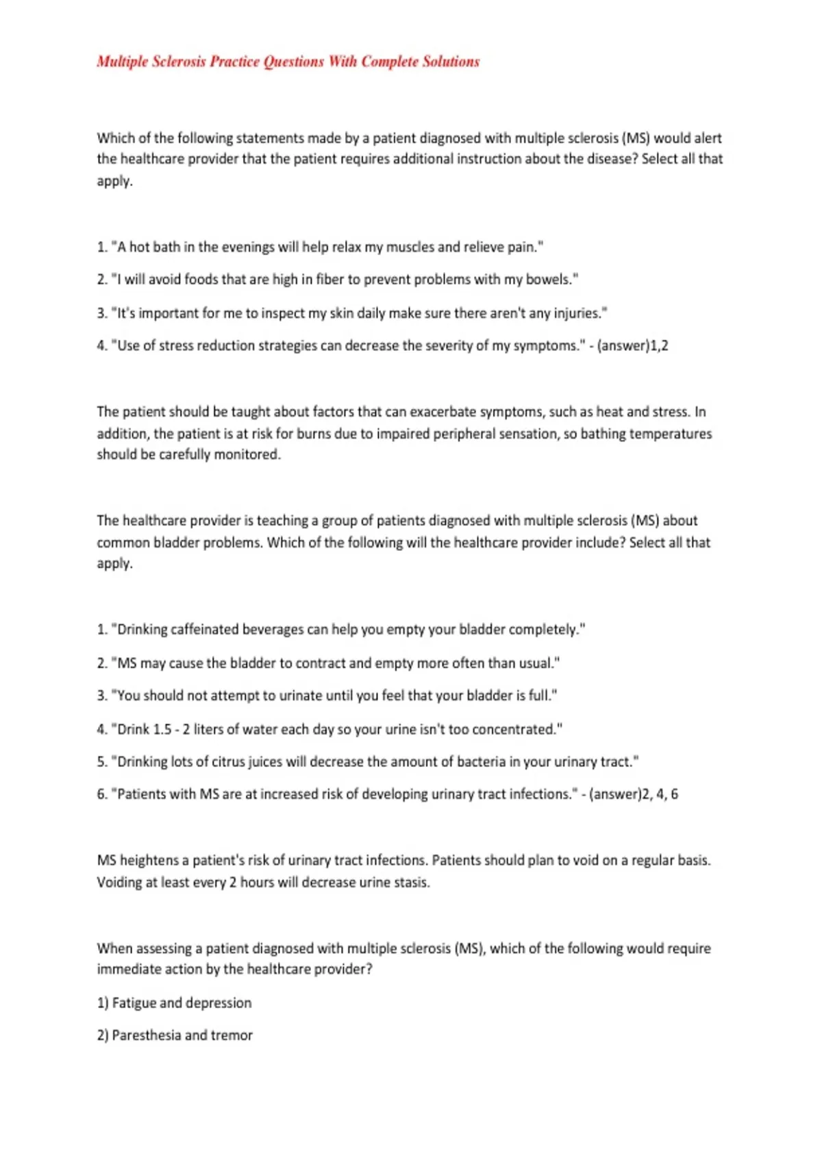 6. "Patients with MS are at increased risk of developing urinary tract infections." - (answer)2, 4, 6