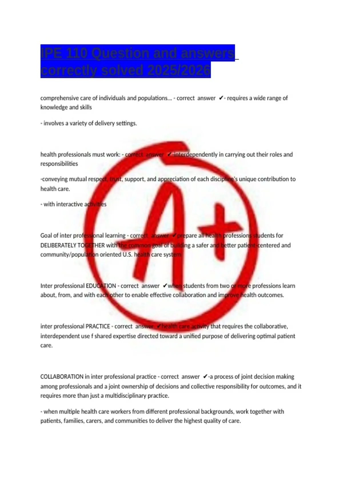 Goal of inter professional learning - correct answer ✔prepare all health professions students for