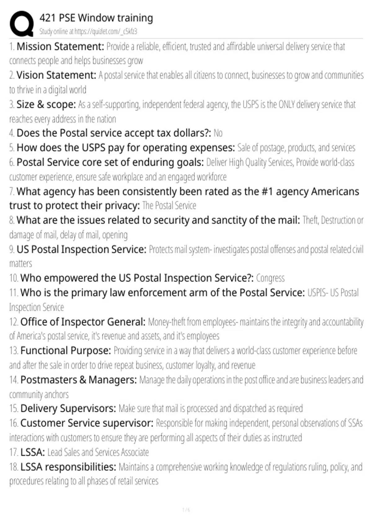 6. Postal Service core set of enduring goals: Deliver High Quality Services, Provide world-class