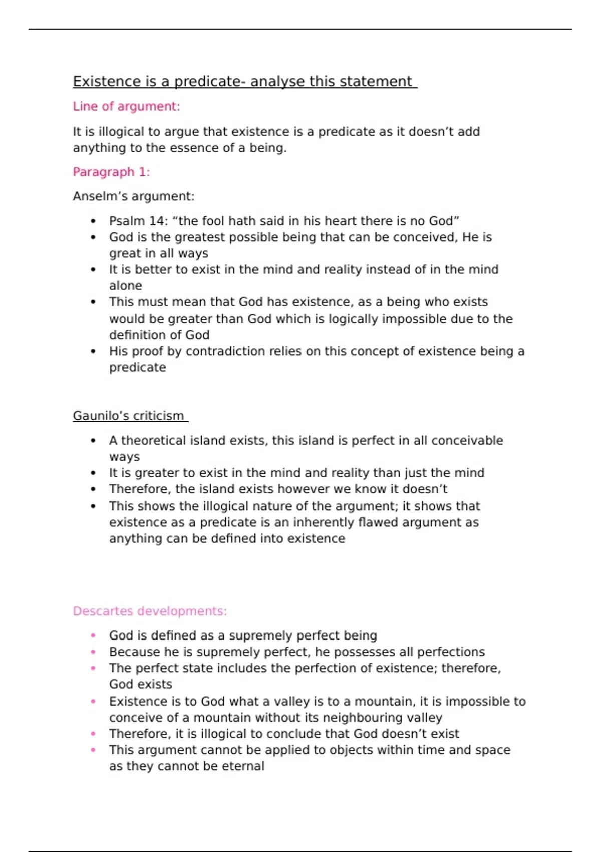 This essay explores one of the fundamental issues of the Ontological argument- the assumption that existence can be treated as a predicate. Using Kant and Gaunillo's critiques of the argument to provide a convincing argument that existence can not be treated as a predicate. This essay plan has been checked by an Alevel RS teacher