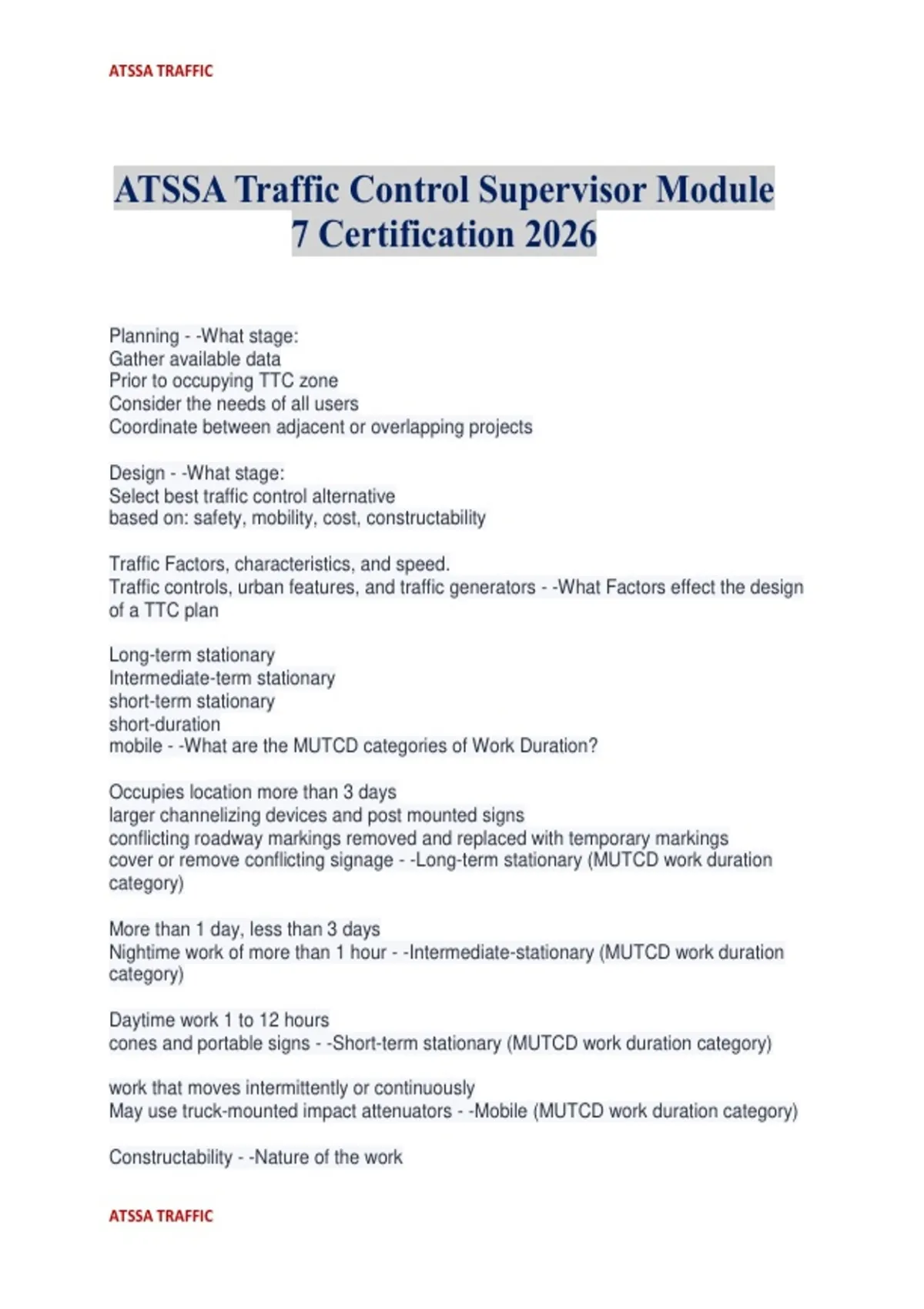ATSSA TRAFFIC ATSSA TRAFFIC ATSSA Traffic Control Supervisor Module 7 Certification 2026 Planning - -What stage: Gather available data Prior to occupying TTC zone Consider the needs of all users Coordinate between adjacent or overlapping projects Design - -What stage: Select best traffic control alternative based on: safety, mobility, cost, constructability Traffic Factors, characteristics, and speed. Traffic controls, urban features, and traffic generators - -What Factors effect the design of a TTC plan Long-term stationary Intermediate-term stationary short-term stationary short-duration mobile - -What are the MUTCD categories of Work Duration? Occupies location more than 3 days larger channelizing devices and post mounted signs conflicting roadway markings removed and replaced with temporary markings cover or remove conflicting signage - -Long-term stationary (MUTCD work duration category) More than 1 day, less than 3 days Nightime work of more than 1 hour - -Intermediate-stationary (MUTCD work duration category) Daytime work 1 to 12 hours cones and portable signs - -Short-term stationary (MUTCD work duration category) work that moves intermittently or continuously May use truck-mounted impact attenuators - -Mobile (MUTCD work duration category) Constructability - -Nature of the work ATSSA TRAFFIC ATSSA TRAFFIC access requirements drainage issues, drainage during construction construction equipment size of work space Access to work area room to maneuver equipment Outside the shoulder On the shoulder with no encroachment On the shoulder with minor encroachment Within the median Within the traveled way - -MUTCD "Locations of work" Phasing - -Refers to TTC projects being broken into multiple steps Could be dangerous due to devices and workers on the move Coordination and timing are key Public relations - -Working with the media News announcements Phone hotline Door hangers / notices PCMS one of the TMP (Transportation Management Plan) requirements Notify Those affected Pre-con meeting Inspection before delivery of devices - -Pre-construction activities Pre-Con - -Meeting between project owner and all other interested parties to review: (contractors, inspectors, engineers, EMS, Utilities) contract requirements construction details work schedules all other items What was observed (devices and position, weather, traffic flow, flagging opperations, incidents) needed corrections and if corrected, when? - -What to doccument