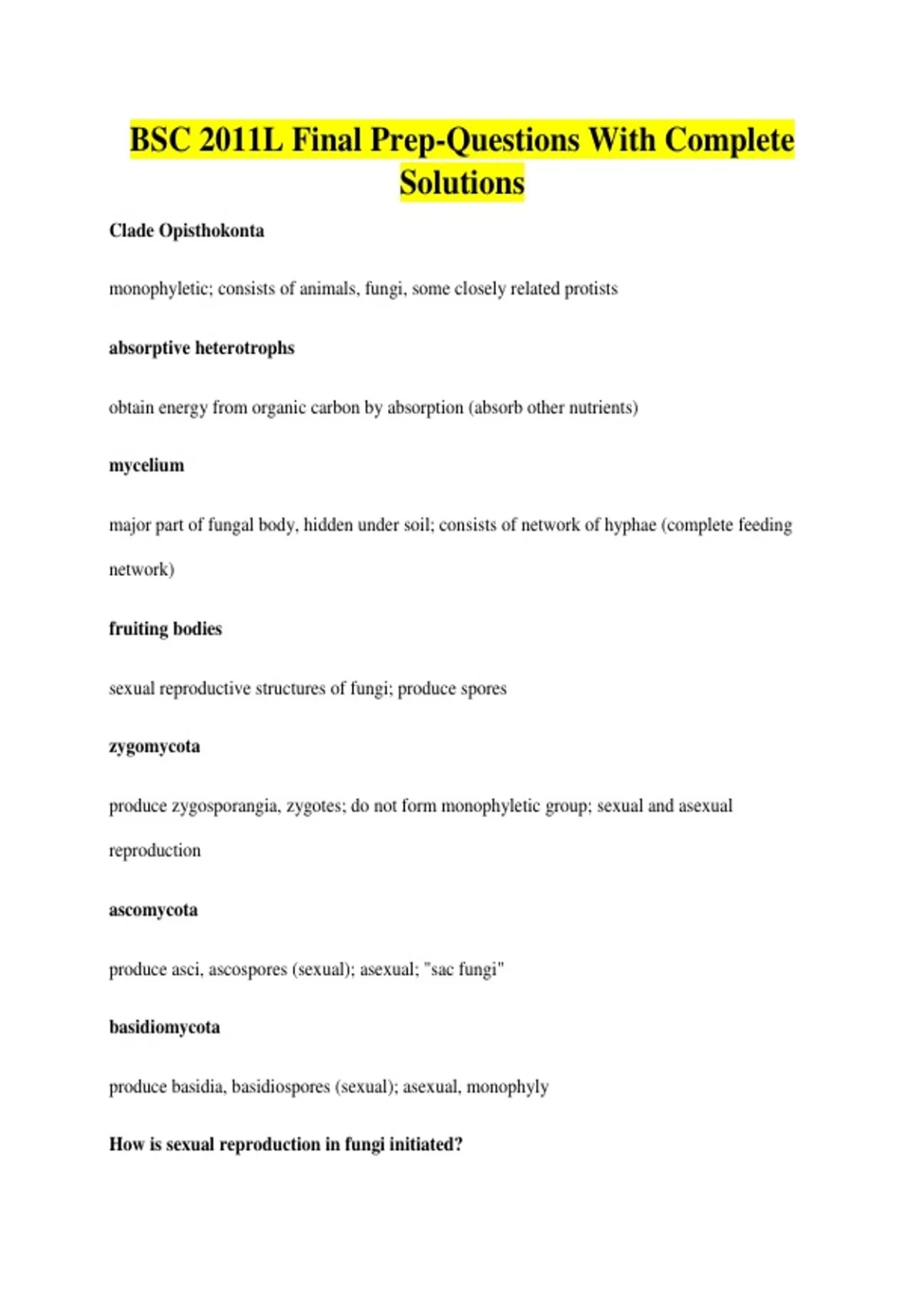 BSC 2011L Final Prep-Questions With Complete Solutions