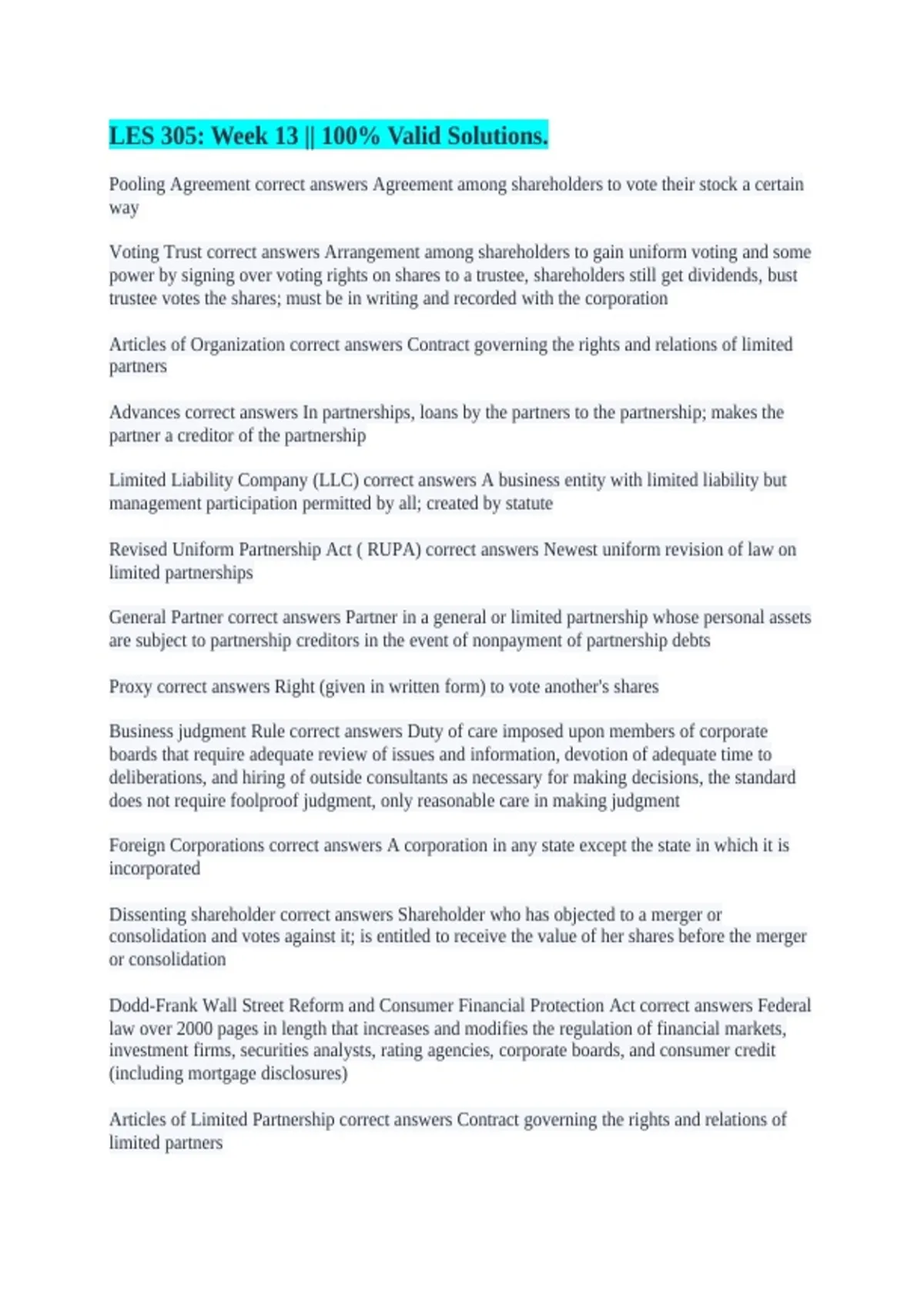 Voting Trust correct answers Arrangement among shareholders to gain uniform voting and some