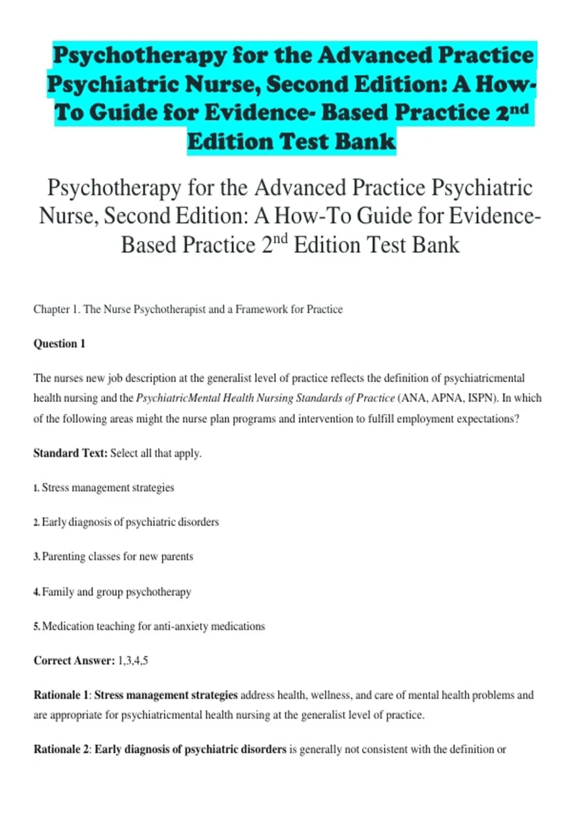 psychiatric disorders and is vital for psychiatricmental health nursing practice at the generalist level of practice.