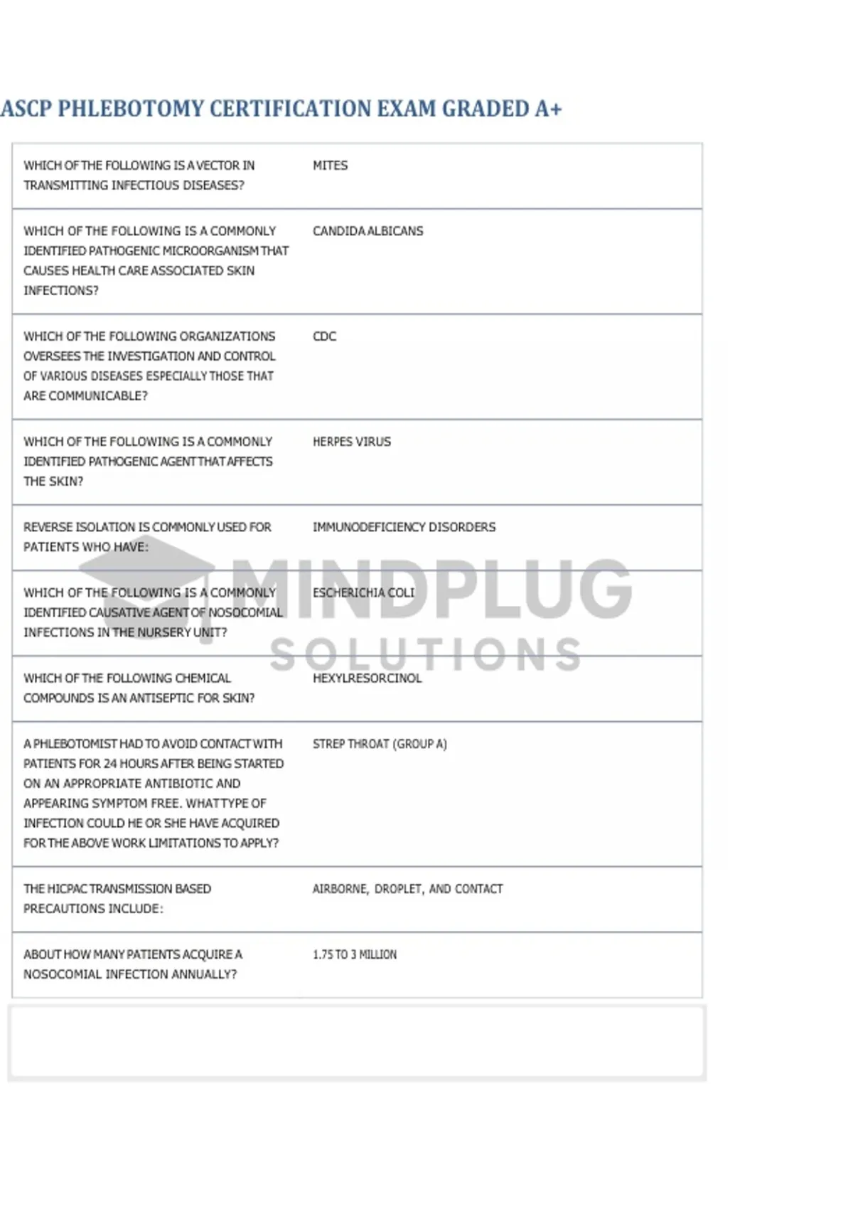 A comprehensive study resource designed to help students prepare for the ASCP administered by the American society . This material includes exam-style practice questions and verified answers that help reinforce essential phlebotomy concepts, specimen collection procedures, safety protocols, and laboratory practices. Ideal for students seeking effective review and confident preparation for the certification exam.