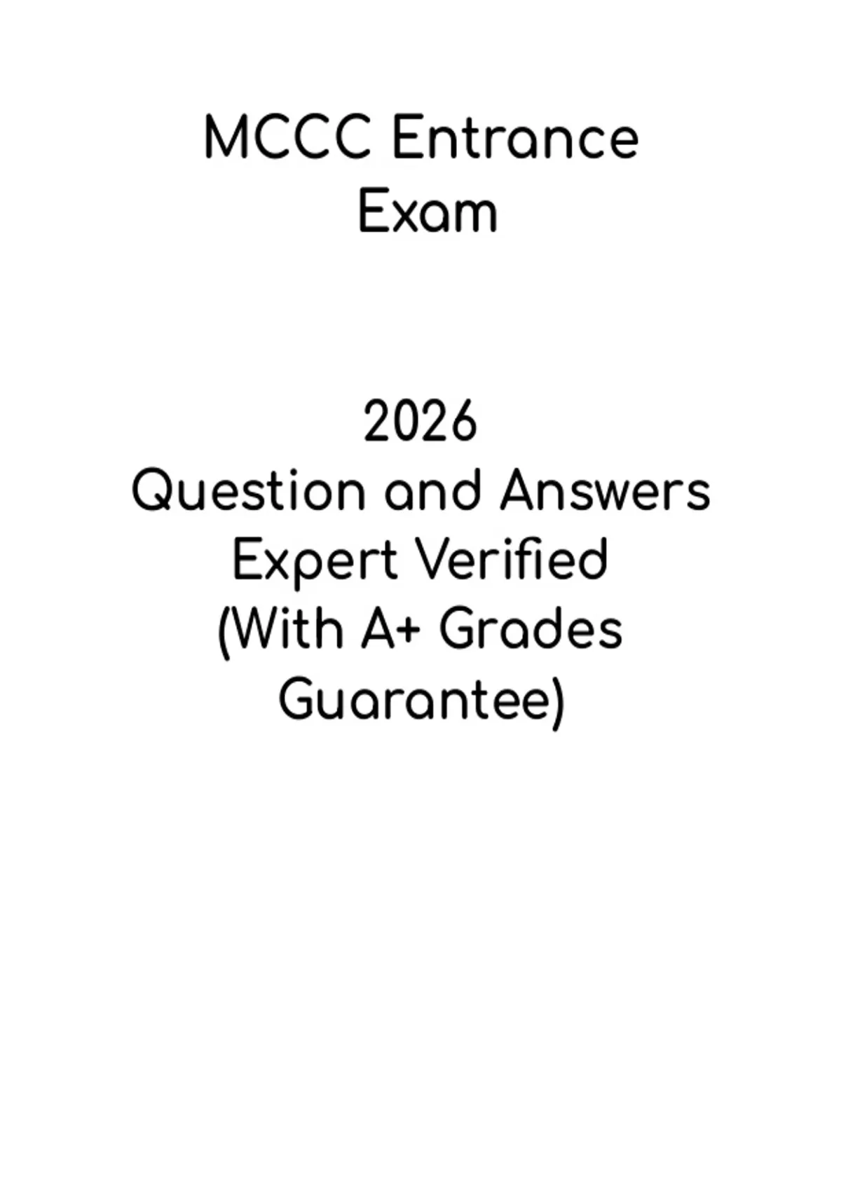 This document provides a comprehensive study guide for the MCCC Entrance Exam. It includes practice questions, review notes, and key academic concepts to help prospective students prepare for admission testing. Ideal for self-study, revision, and exam preparation, this guide helps learners strengthen their knowledge, improve test-taking skills, and confidently approach the MCCC entrance exam.