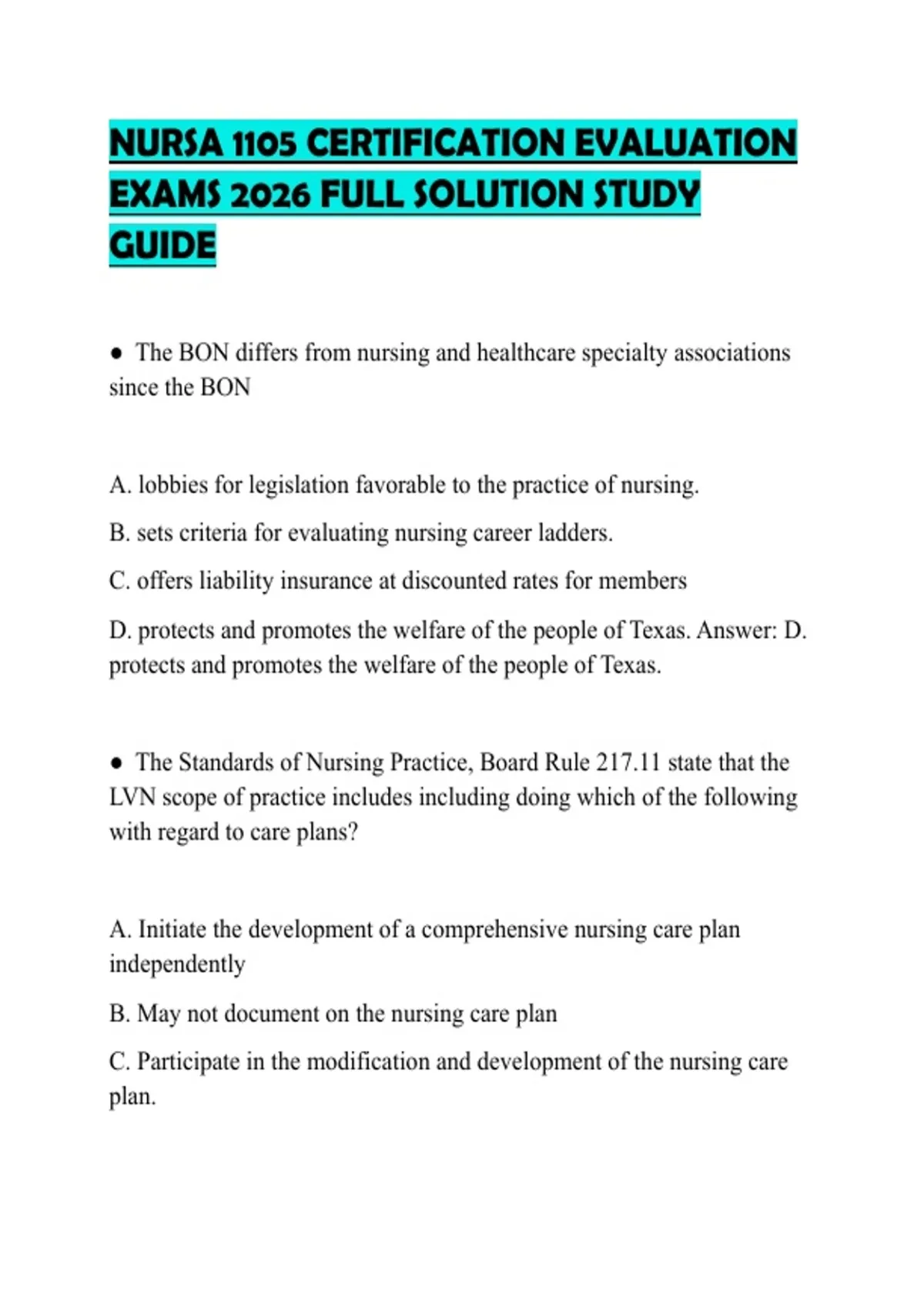 NURSA_1105_CERTIFICATION_EVALUATION_EXAMS_2026_FULL_SOLUTION_STUDY