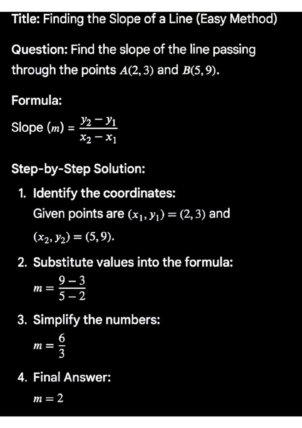 This document provides a clear and easy-to-understand explanation of how to find the slope of a line passing through two points. It includes the slope formula, step-by-step calculations, and solved examples. Perfect for 8th-grade students and high school algebra revision