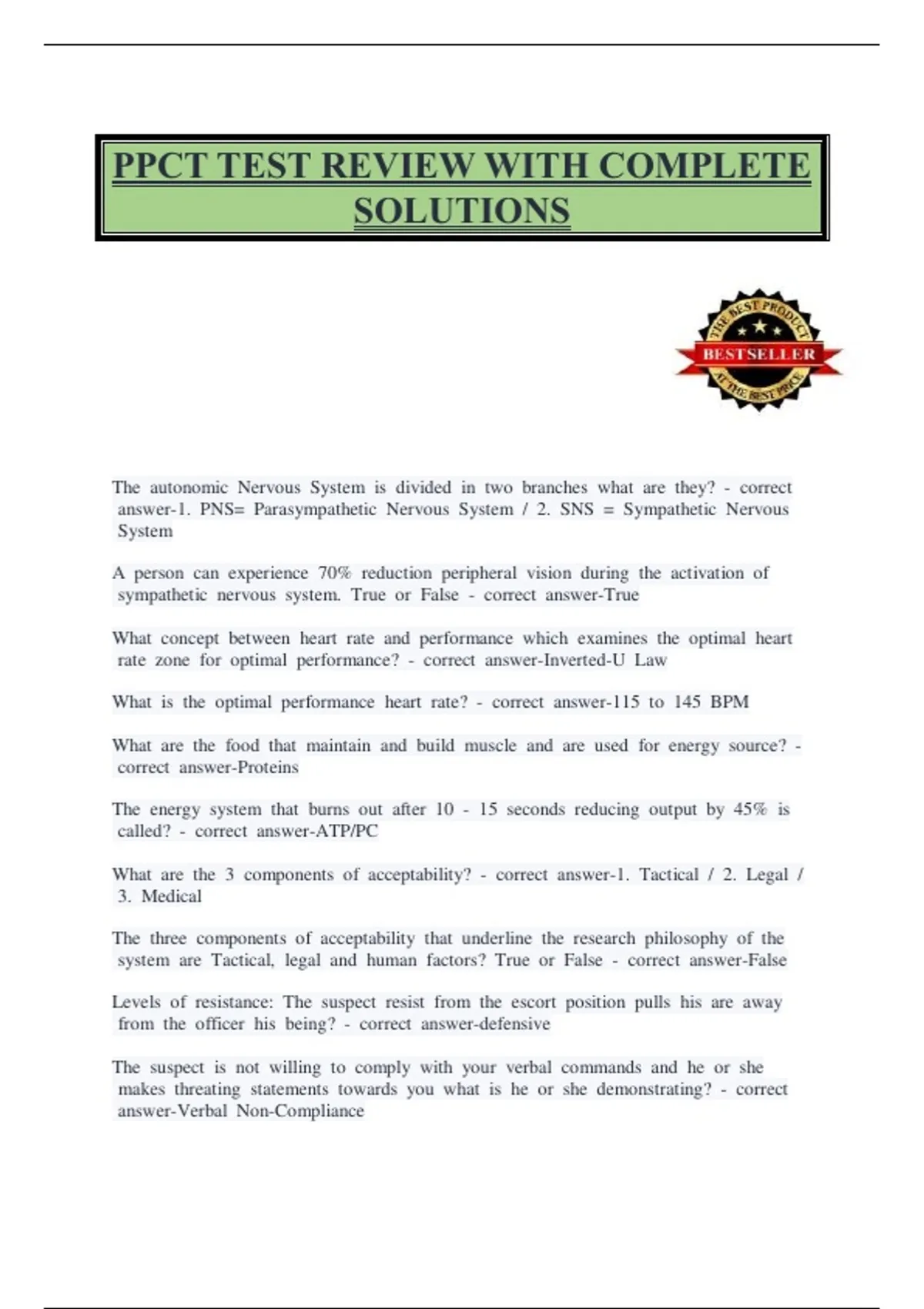 This document provides a comprehensive review for the PPCT (Pressure Point Control Tactics) test, including all questions with complete solutions. It covers essential topics such as control techniques, use-of-force principles, safety protocols, scenario-based applications, and commonly tested concepts in law enforcement training. Designed for trainees and students, this resource helps reinforce key knowledge, practice exam-style questions, and ensure thorough preparation for PPCT certification assessments
