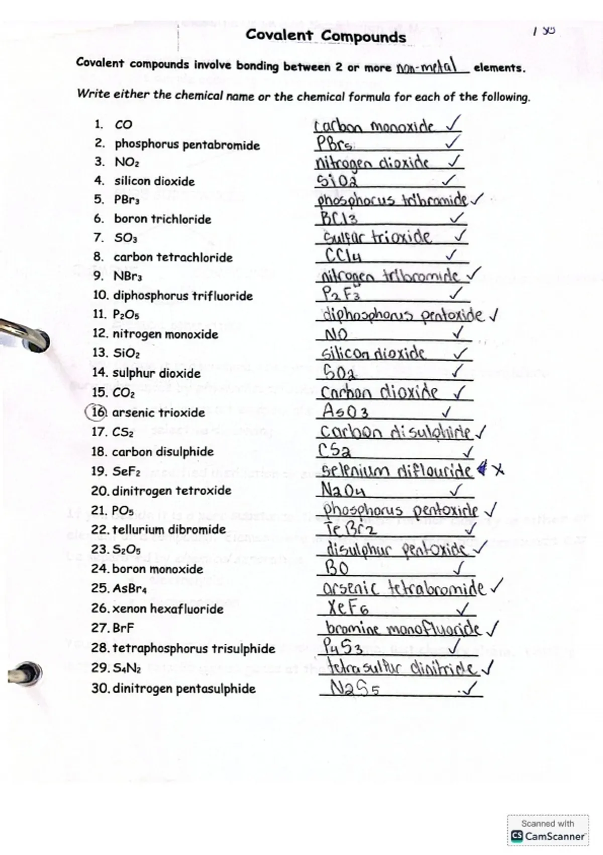 This document is a worksheet on covalent compounds. It shows my understanding of how to name covalent compounds and write their formulas using prefixes. It includes examples and practice questions demonstrating these concepts.