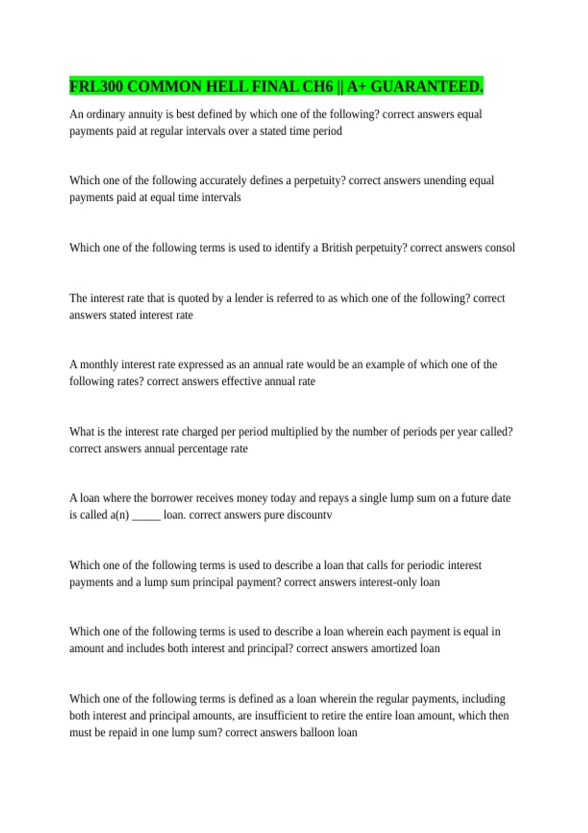 must be repaid in one lump sum? correct answers balloon loan