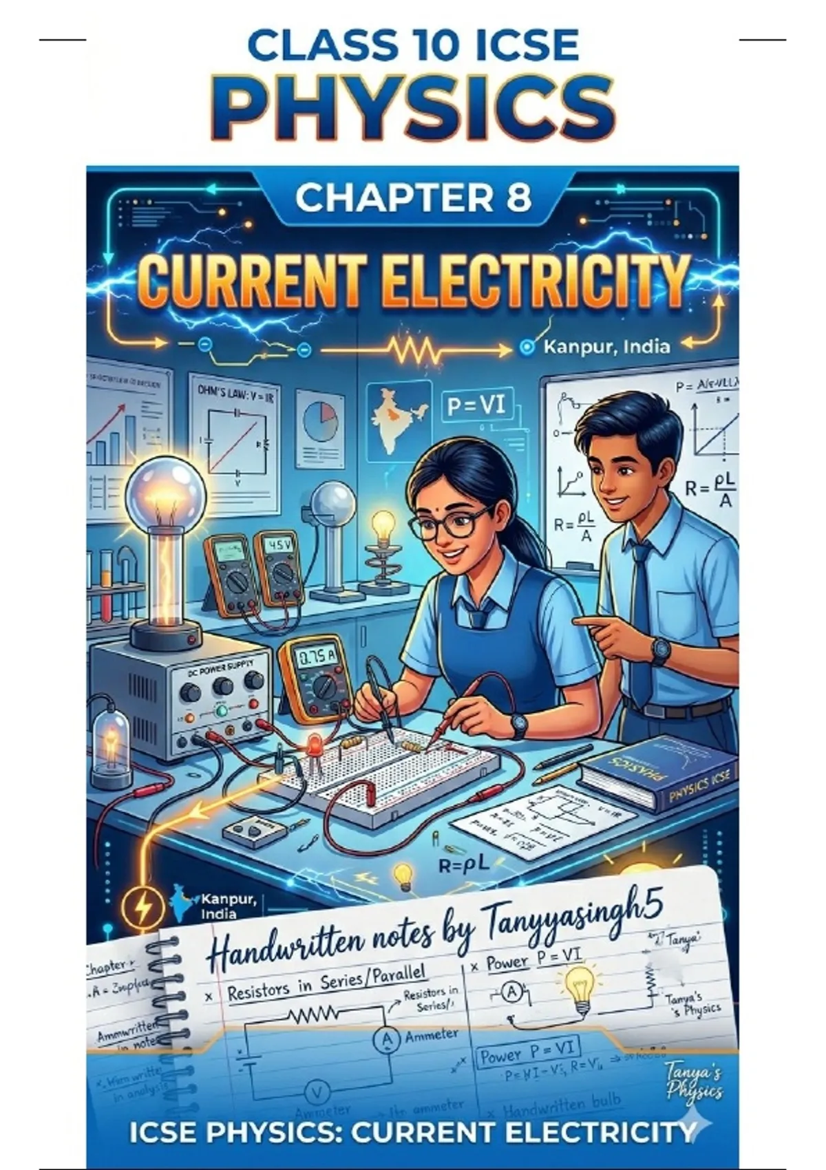 These are comprehensive, aesthetic, and high-quality handwritten notes for ICSE Class 10 Physics - Chapter 8: Current Electricity. They are designed specifically for board exam preparation and quick revision. Key Highlights included in the PDF: * Detailed Definitions: Clear explanations of Charge, Current, Potential, and Resistance. * Laws & Formulas: Includes Ohm's Law ,Resistivity, and Electric Power * Visual Learning: Comparison of I-V and V-I graphs with slope analysis for both Conductance and Resistance. * Exam-Focused Topics: Covers Ohmic vs. Non-Ohmic resistors , factors affecting EMF , and the choice of materials for various electrical components like Fuses and Heaters. * Bonus: Includes specific SI units and constant values needed for numericals.