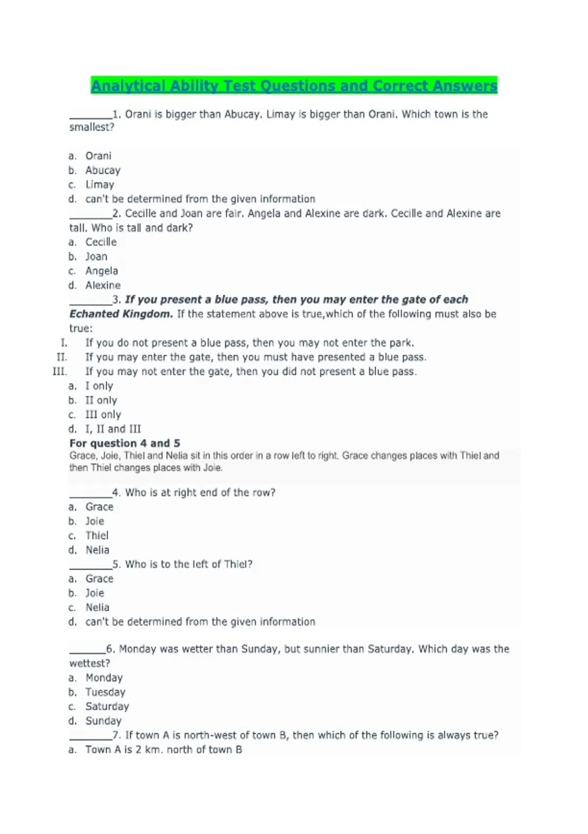 Analytical Ability Test Questions and Correct Answers