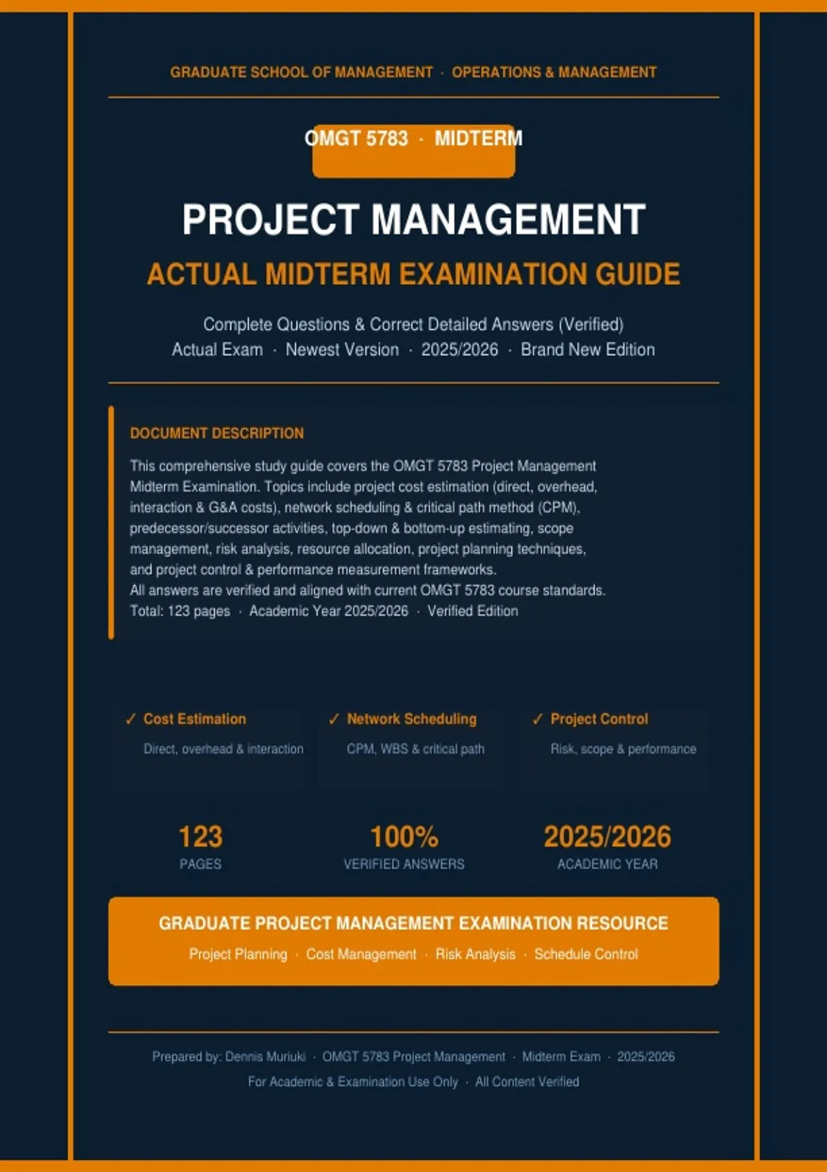 This comprehensive study guide covers the OMGT 5783 Project Management Midterm Examination. Topics include project cost estimation (direct, overhead, interaction & G&A costs), network scheduling & critical path method (CPM), predecessor/successor activities, top-down & bottom-up estimating, scope management, risk analysis, resource allocation, project planning techniques, and project control & performance measurement frameworks. All answers are verified and aligned with current OMGT 5783 course standards. Total: 123 pages · Academic Year 2025/2026 · Verified Edition