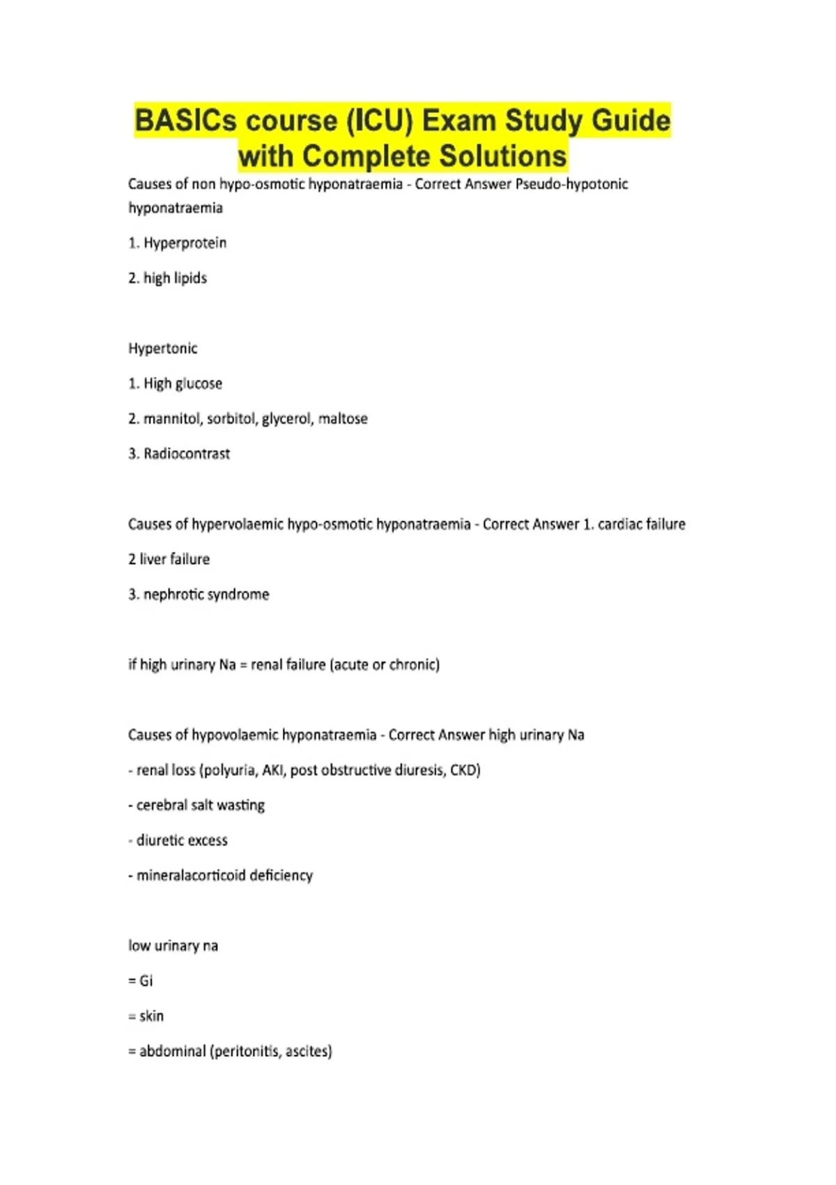 BASICs course (ICU) Exam Study Guide with Complete Solutions Causes of non hypo-osmotic hyponatraemia - Correct Answer Pseudo-hypotonic hyponatraemia 1. Hyperprotein 2. high lipids Hypertonic 1. High glucose 2. mannitol, sorbitol, glycerol, maltose 3. Radiocontrast Causes of hypervolaemic hypo-osmotic hyponatraemia - Correct Answer 1. cardiac failure 2 liver failure 3. nephrotic syndrome if high urinary Na = renal failure (acute or chronic) Causes of hypovolaemic hyponatraemia - Correct Answer high urinary Na - renal loss (polyuria, AKI, post obstructive diuresis, CKD) - cerebral salt wasting - diuretic excess - mineralacorticoid deficiency low urinary na = Gi = skin = abdominal (