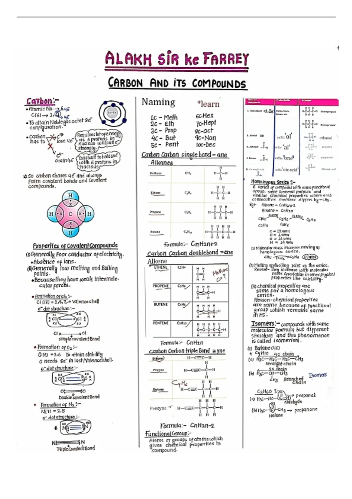 Well-prepared study documents on the topic Carbon and Its Compounds. These notes explain the concepts in a simple and easy-to-understand way. Includes topics like bonding in carbon, covalent bonds, and hydrocarbons. Also covers functional groups and homologous series. Important reactions of carbon compounds are clearly explained. Neatly organized for quick reading and revision. Helpful for exam preparation and assignments. Suitable for school students studying chemistry. Clear explanations with useful examples. A great resource for understanding and revising the chapter easily.